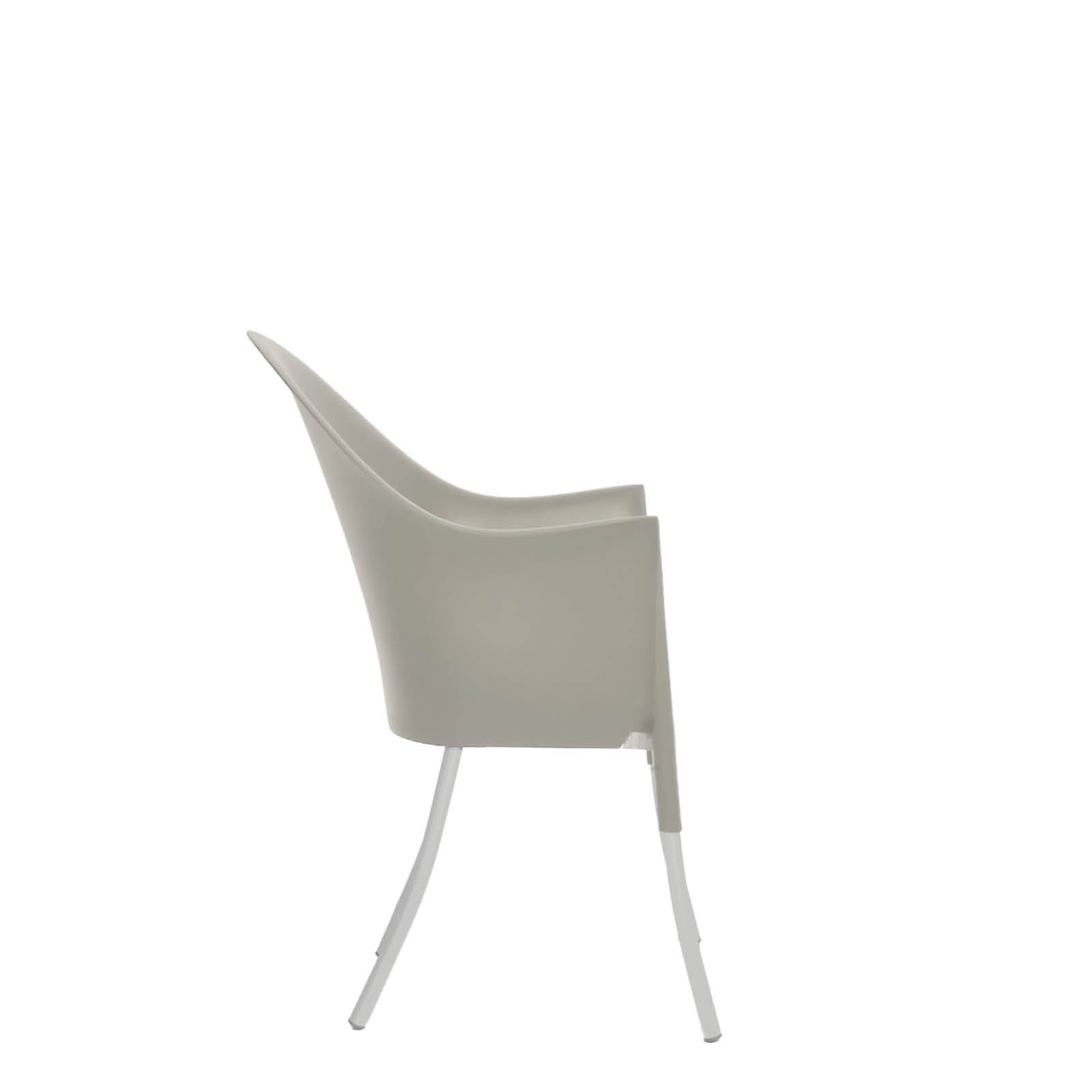Vyrobená z polypropylénu, s hliníkovou konštrukciou, stolička je ľahká, odolná a dokonale sa hodí do súkromných aj verejných priestorov. Voliteľný biely poťah nezakrýva tvar, ale jemne ho zvýrazňuje, čím pridáva eleganciu.