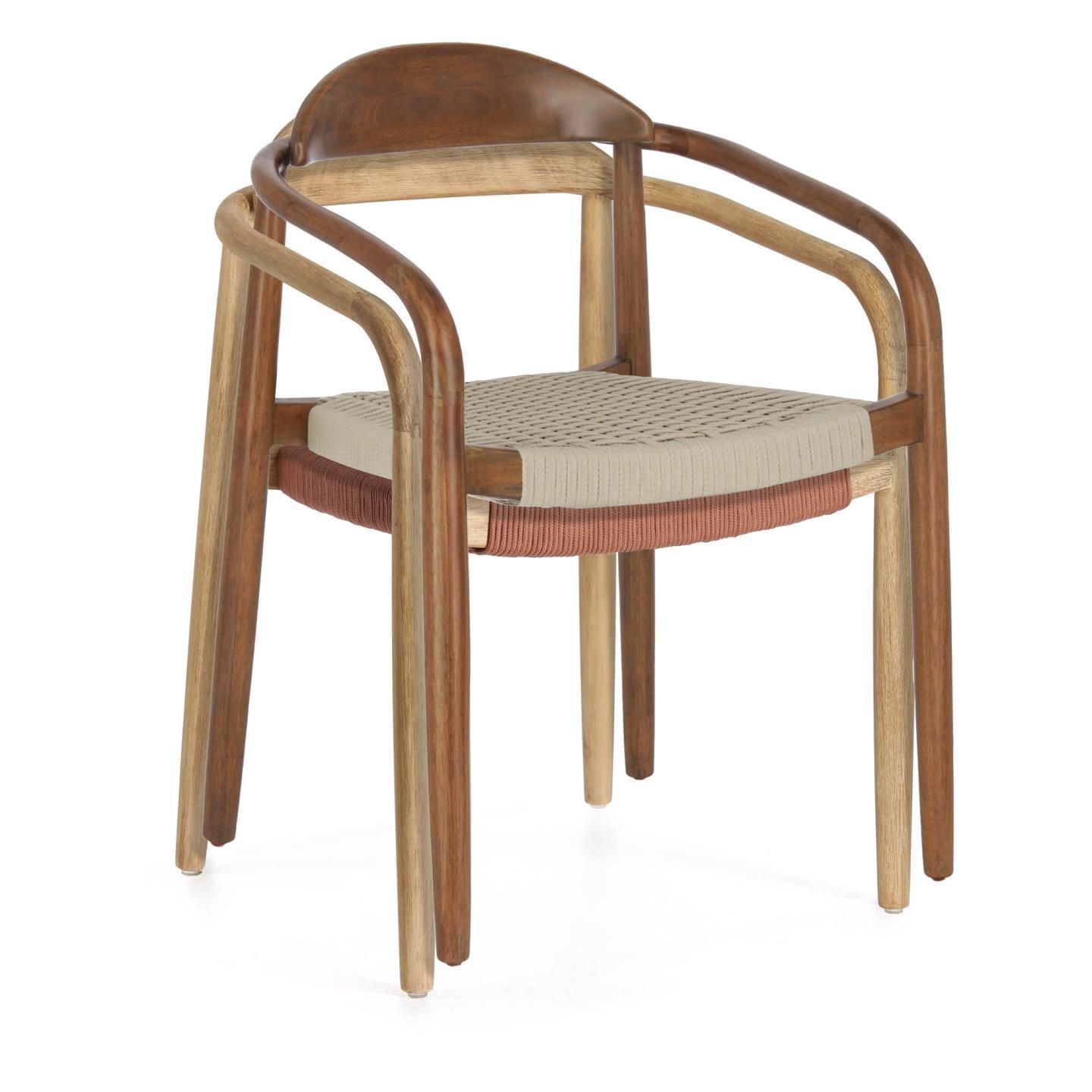 Struktura beżowego krzesła wykonana z litego drewna akacjowego w kolorze orzecha włoskiego zachwyca unikalnymi odcieniami i słojami, tworząc niepowtarzalny charakter. Drewno pochodzi z lasów o zrównoważonej i kontrolowanej wycince, co czyni krzesło nie tylko estetycznym, ale również zrównoważonym wyborem – zgodnym z filozofią projektu Kave Cares.