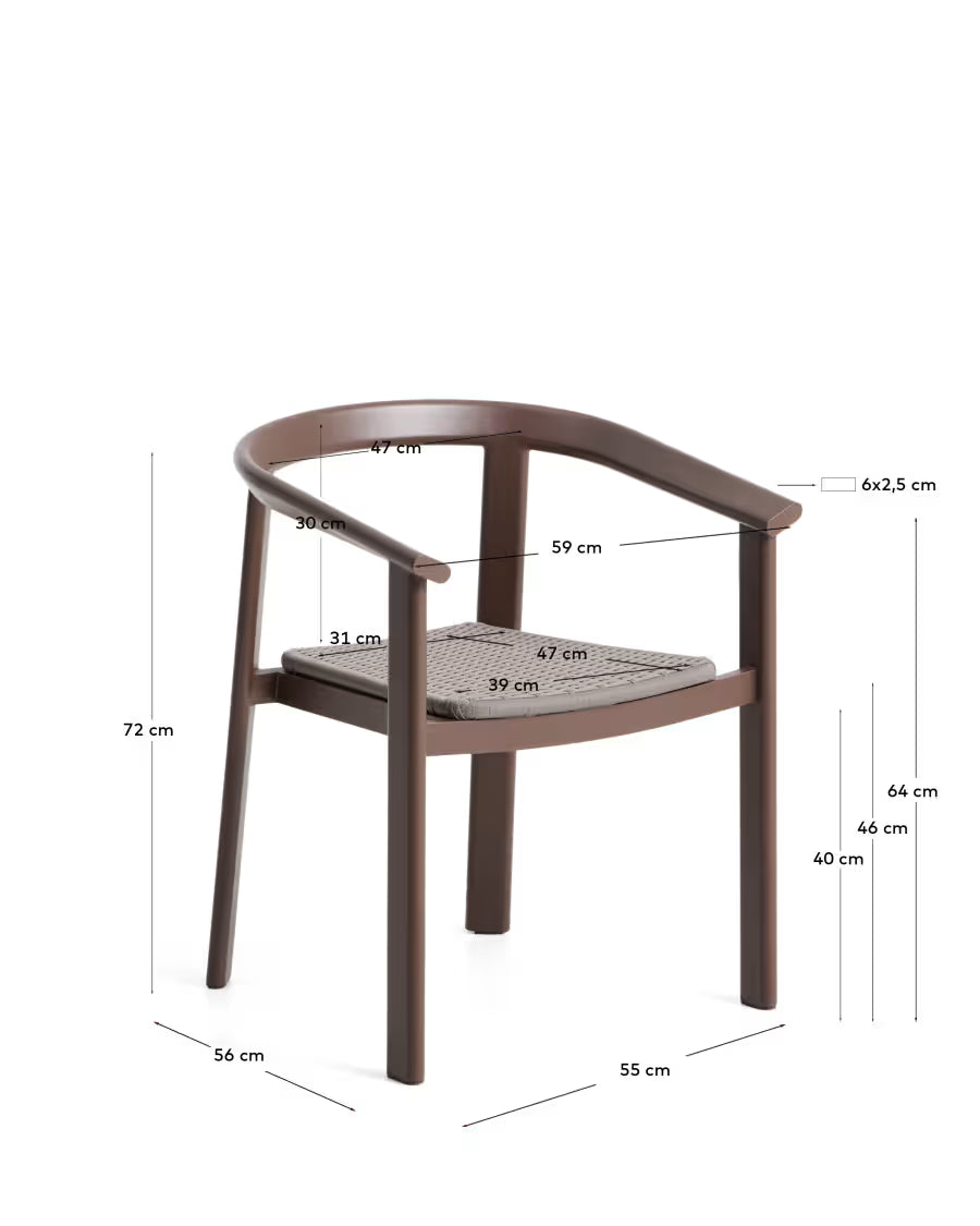 Záhradná stolička Erice je elegantnou a funkčnou voľbou ako do interiéru, tak aj do vonkajších priestorov. Spojuje ľahkú a odolnú hliníkovú konštrukciu s opierkami na ruky a ručne pletené sedadlo z lana, ktoré je odolné voči UV žiareniu, čím zabezpečuje dlhodobý vzhľad. Vďaka svojej odolnosti voči hrdzi, korózii a UV žiareniu je stolička Erice vynikajúcou voľbou do záhrady, na terasu alebo do iných vonkajších priestorov. Navyše, možnosť stohovania (až 4 kusy) robí z nej praktický nábytok, ktorý sa ľahko skladuje, keď sa nepoužíva.