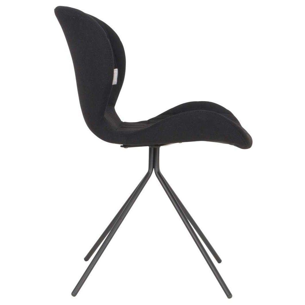 OMG to nowoczesne krzesło z charakterem, które zachwyca swoim kształtem. Przyciągające wzrok siedzisko, obite wysokiej jakości czarną tkaniną, ozdabiają przeszycia w romby. Zarówno siedzenie jak i oparcie zostały wyprofilowane tak, żeby nawet przez długi czas użytkowania zapewniać komfort. Na metalowy stelaż składają się cztery, zbiegające się do środka nogi w kolorze czarnym.