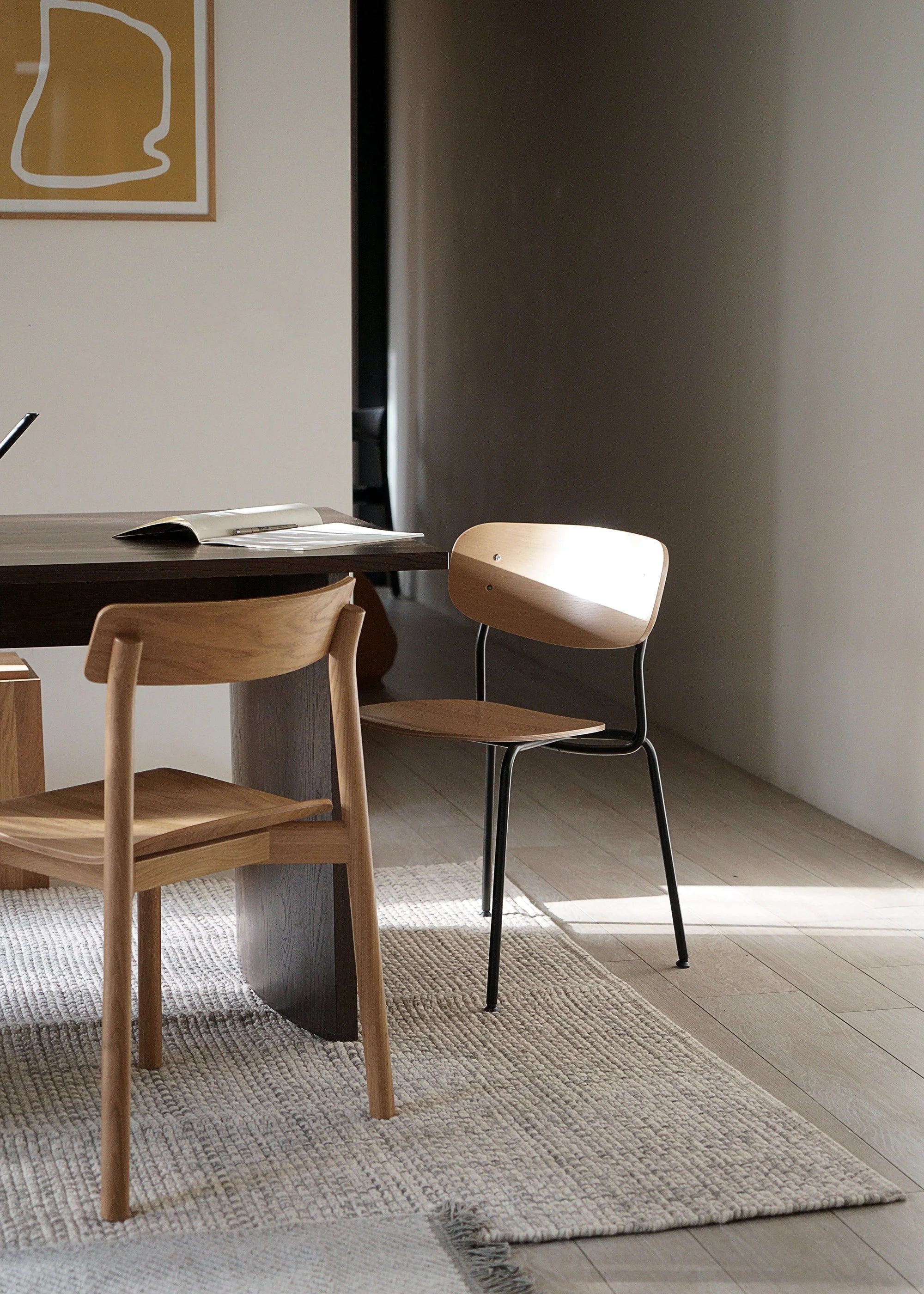 Stolička Splot je symbolom modernej ľahkosti a precíznosti, kde sa funkčnosť spája s rafinovanou estetikou. Sedadlo vyrobené z ohýbanej preglejky s prírodným dreveným dyhou spočíva na oceľovom ráme, ktorého charakteristické, „tkané“ prekríženie zadných nôh zdôrazňuje technológiu ohýbania a majstrovstvo spracovania. Táto jemná kompozícia detailov vnáša do interiéru tichú eleganciu, pričom nábytku dodáva výnimočný, sochársky charakter.