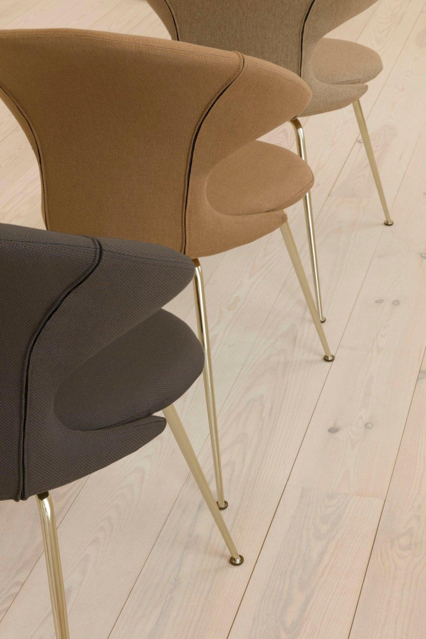 Stolička je dostupná v 17 starostlivo vybraných farbách látky Horizons, ktorá je z 100% recyklovaná alebo v 2 látkach z kolekcie Teddy. Okrem toho, možnosti nôh zahŕňajú mosadzné, chrómované alebo čierne povrchové úpravy, čo umožňuje prispôsobiť stoličku rôznym štýlom interiéru. Toto spojenie estetiky, funkčnosti a udržateľného prístupu k materiálom robí z Time Flies jedinečný a trvácny návrh.