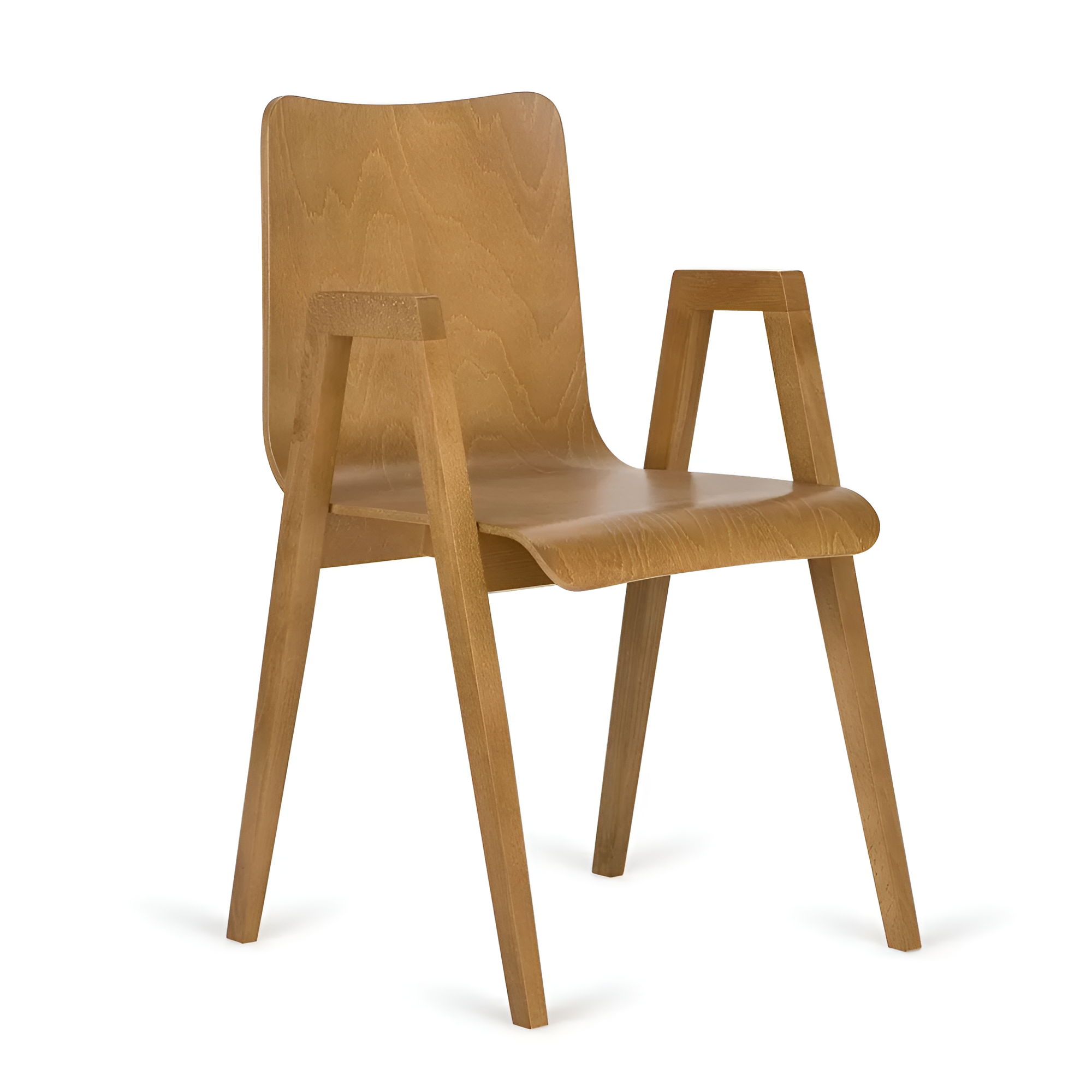 Stolička s podrúčkami Link od Paged je harmonické spojenie ľahkosti formy a pevnosti spracovania, vytvorené s ohľadom na funkčné a moderné interiéry. Ohýbaná z jedného plechu preglejky vytvára štíhle operadlo a sedadlo, ktorých profilované hrany nielen zvyšujú komfort používania, ale aj dodávajú nábytku elegantný, rafinovaný charakter.
