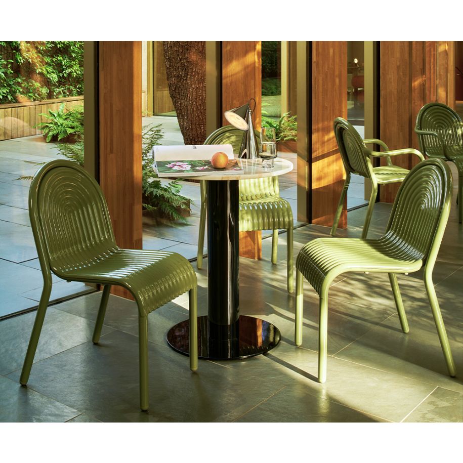 Exteriérová stolička Groove je súčasťou prvej kolekcie záhradného nábytku od Toma Dixona, inšpirovanej dizajnom hliníkovej stoličky Hydro z roku 2021. Stolička sa vyznačuje vypuklými ryhami v štýle art deco a je vyrobená z kvalitného hliníka, čo zabezpečuje jej odolnosť voči korózii a trvácnosť. Vďaka pokročilým výrobným technikám a práškovému lakovaniu, ktoré je bez rozpúšťadiel a VOC, stolička sa skvele hodí do vonkajších podmienok.