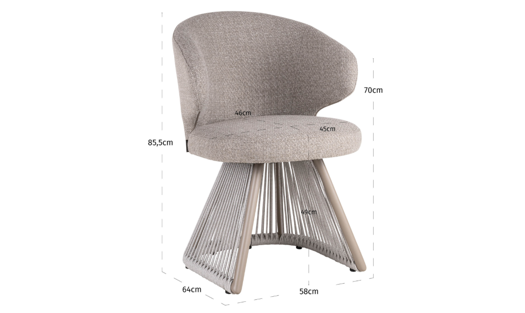 Záhradná stolička Nuba je elegantná voľba, ktorá sa vyznačuje kombináciou moderného dizajnu a funkčnosti. Ručne pletený Olefinový povraz, odolný voči UV žiareniu, v kombinácii s hliníkovou konštrukciou zabezpečuje trvácnosť a odolnosť voči poveternostným podmienkam, čo robí túto stoličku vynikajúcou voľbou do záhrad, terás a vonkajších priestorov. Poduška sedadla, ktorá rýchlo schne, pridáva komfort, a jej univerzálny dizajn sa hodí do rôznych aranžmánov. Je to ideálna voľba na to, aby ste priniesli hotelový štýl na čerstvom vzduchu.
