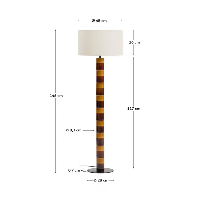 Lampa podłogowa posiada ceramiczną podstawę oraz metalową ramę, co zapewnia stabilność i trwałość. Klosz wykonany został z bawełny, dzięki czemu przyjemnie filtruje światło, tworząc nastrojowy efekt. Kabel został pokryty tkaniną, co podkreśla jakość wykonania i estetykę. Materiały naturalne stanowią mniej niż 25% całości, a produkt nie jest wykonany z materiałów pochodzących z recyklingu. Kompatybilna z żarówką E27 (maks. 40 W).