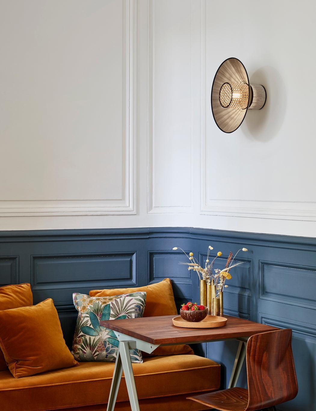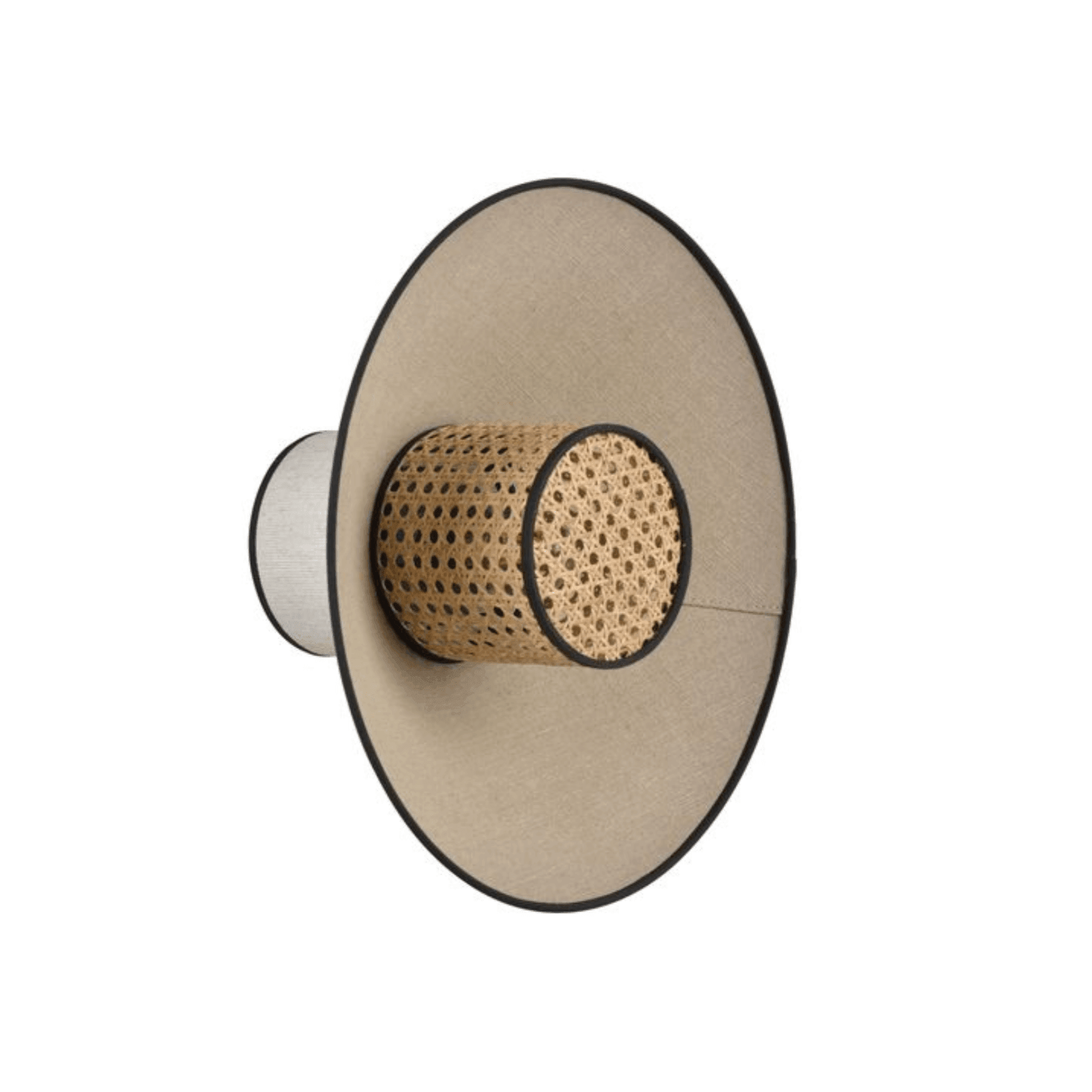 Lampa ścienna Singapour w odcieniu beżowym to stożkowa konstrukcja z abażurami z lnu i wikliny. Posiada okrągłą podstawę z malowanego metalu, dostosowaną do systemu DCL, co umożliwia łatwą regulację oświetlenia.