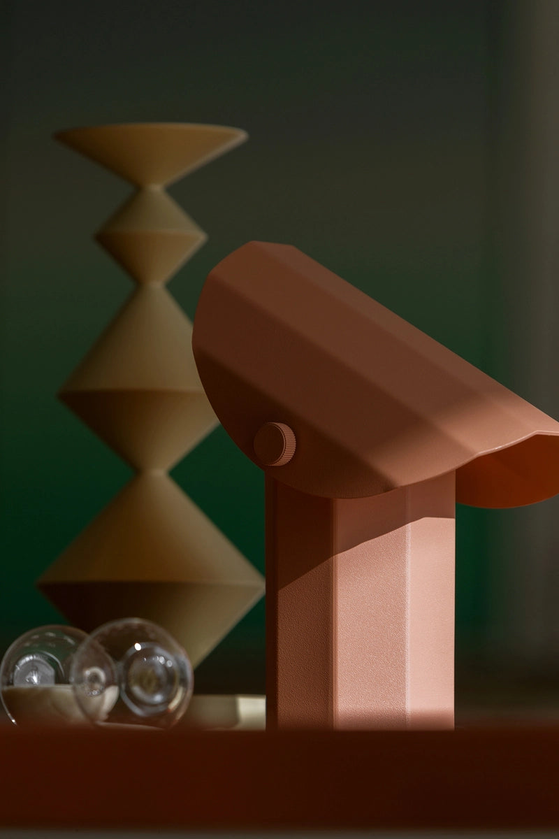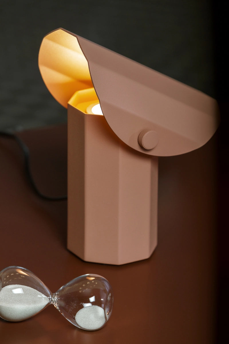 Stolná lampa Apolin od dizajnéra Grynasz Studio je výnimočným príkladom súčasného dizajnu inšpirovaného priemyselným dizajnom z polovice 20. storočia. Jej forma odkazuje na modely vytvárané v závodoch MEOS a ZAOS, a fasetový tienidlo plní funkciu reflektora, rozptyľujúc svetlo jemným a atmosférickým spôsobom. Konštrukcia vyrobená z profilovanej nehrdzavejúcej ocele lakovanej práškovou farbou v odtieni zlomeného ružového harmonicky zapadá do modernistickej estetiky. Stolná lampa má zabudovaný stmievač, ktorý umožňuje reguláciu intenzity svetla, čo ju robí praktickou a pohodlnou na každodenné používanie.