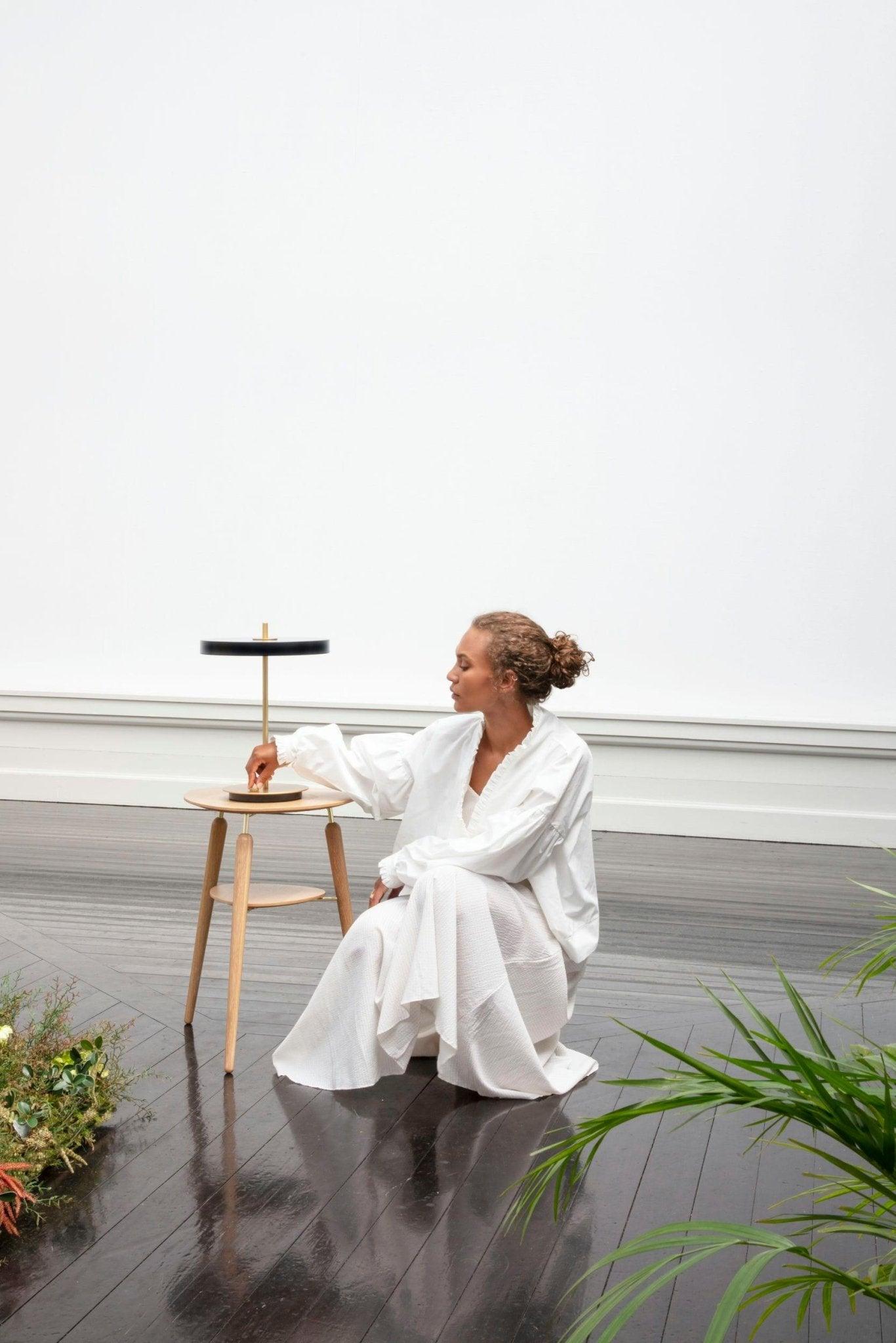 Stolná lampa Asteria Table je výnimočným prvkom interiéru, vybaveným vstavaným LED panelom s difuzérom, ktorý zabezpečuje jemné osvetlenie miestnosti. Mosadzný stĺp prechádzajúci lampou pridáva eleganciu a pevnosť celej konštrukcii, čím jej dodáva kompaktný vzhľad.