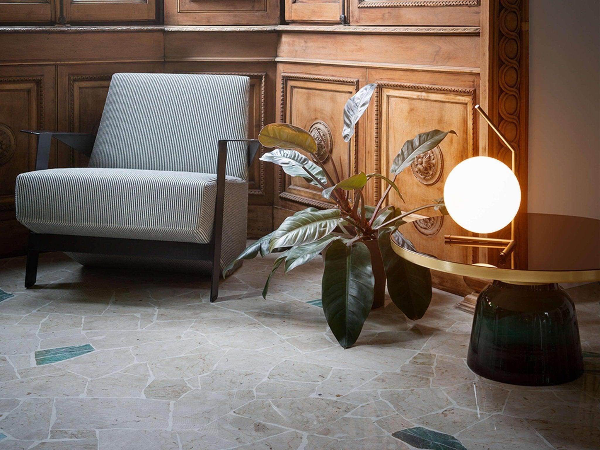 Ic Lights je harmonijná stolná lampa s veľkým, bielym tienidlom z opálového skla, ktoré krásne kontrastuje s rámom z kovu v farbe mosadze. Jej moderný a minimalistický tvar sa skvele hodí do spálne, jedálne alebo pracovne. Lampa vyžaruje jemné, útulné svetlo.