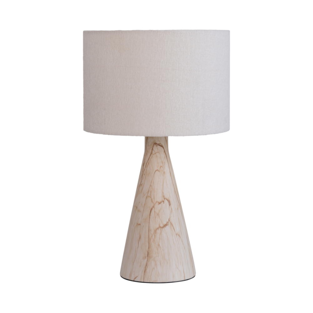 Stolná lampa Jun je subtílnym spojením umenia a funkčného dizajnu. Jej keramická základňa bola starostlivo dokončená technikou ponorenia, vďaka ktorej získala jedinečnú, kamennú textúru pripomínajúcu prírodný travertín. Tento detail dodáva lampa šľachetný a organický charakter, ktorý sa dokonale hodí k elegantnému tienidlu z ľanovej tkaniny v odtieni zlomené bielej.