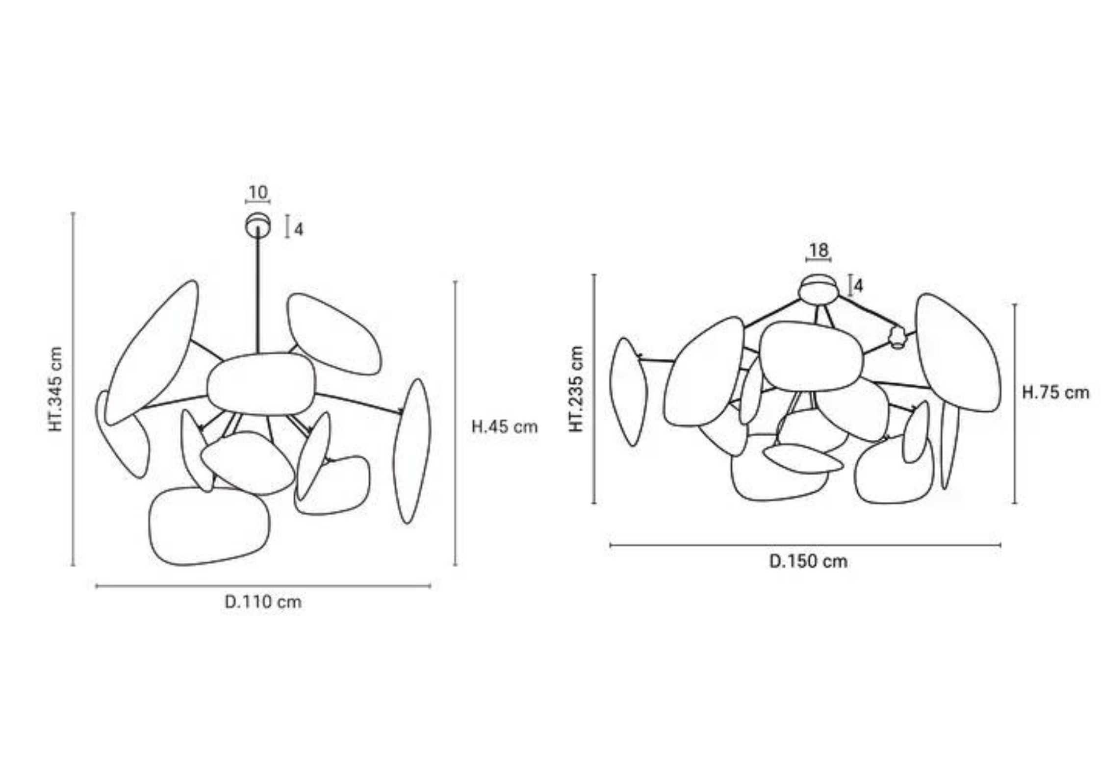 Týchto 10 alebo 13 paravánov z ľanovej textílie dodáva lampe neobyčajný vzhľad, rozptyľujúc svetlo spôsobom, ktorý je jemný a príjemný. Navyše, textilné šnúrky a kovová strecha s možnosťou prispôsobenia k systému DCL uľahčujú inštaláciu a reguláciu lampy podľa potreby.