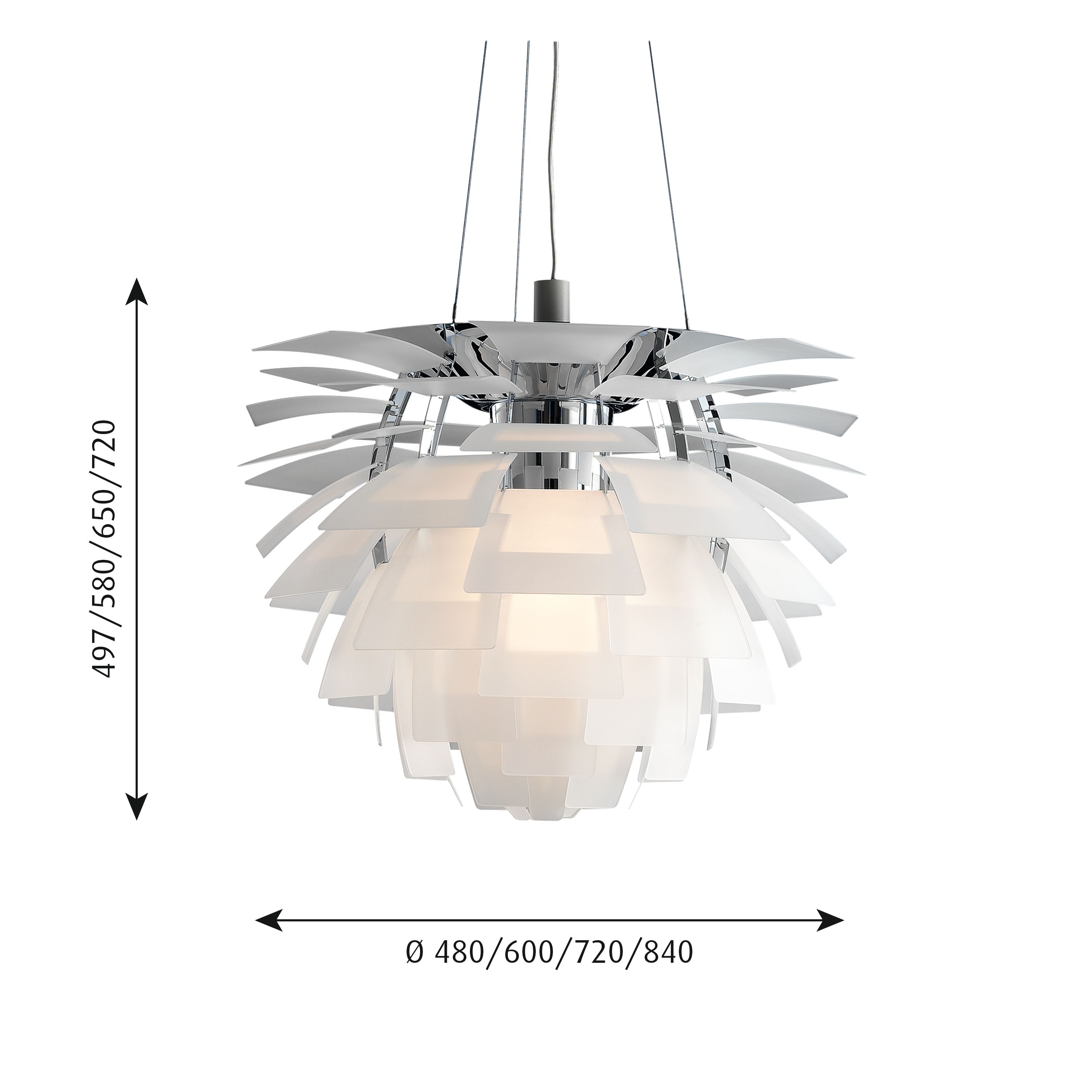 Spektakulárna závesná lampa PH Artichoke Glass je sklenenou interpretáciou jedného z najrozpoznateľnejších projektov Poula Henningsena, vytvoreného v roku 2008. Jej koncepcia však siaha do rokov 1927–1931, keď Henningsen vytvoril model PH Septima – lampu so siedmimi vrstvami skla s výnimočnou štruktúrou svetla. V závesnej lampe PH Artichoke Glass dizajnér spojil svoju fascináciu svetlom a geometriou, vytvárajúc formu pozostávajúcu z 72 starostlivo rozmiestnených, ručne pieskovaných sklenených „listov“. Každý z nich odráža a rozptyľuje svetlo spôsobom, ktorý zabezpečuje 100% absenciu oslnenia a vytvára charakteristický, kryštalický efekt pripomínajúci ľad. Toto osvetlenie je symbolom dánskeho modernizmu a luxusnej elegancie.