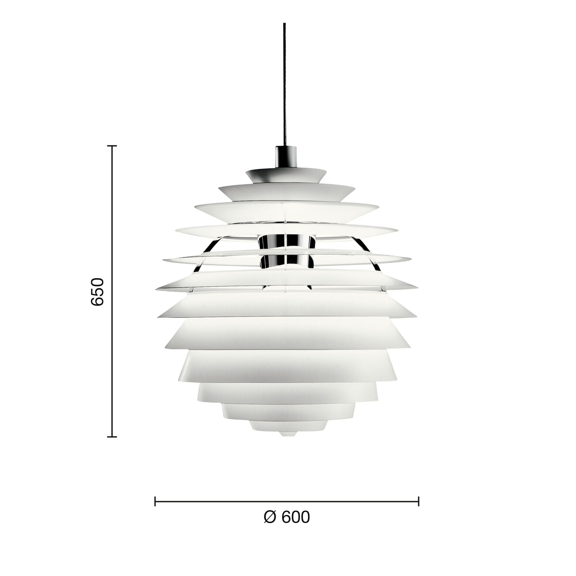 Výnimočná závesná lampa PH Louvre je jedným z najharmonickejších diel Poula Henningsena, navrhnutá v roku 1957 pre Cirkev adventistov v Skodsborgu v Dánsku. Tento guľový model sa zakladá na princípe rovnomerného osvetlenia všetkých plôch pod rovnakým uhlom, čo umožňuje dosiahnuť ideálne rozptýlené, oslneniu zbavené svetlo. Konštrukcia pozostávajúca z 13 hliníkových tienidiel upevnených na štyroch podperách je rozvinutím predchádzajúceho projektu Spiral z roku 1942. Závesná lampa PH Louvre spája presnosť matematiky s umeleckou ľahkosťou, predstavujúc dokonalú kombináciu formy a funkcie.