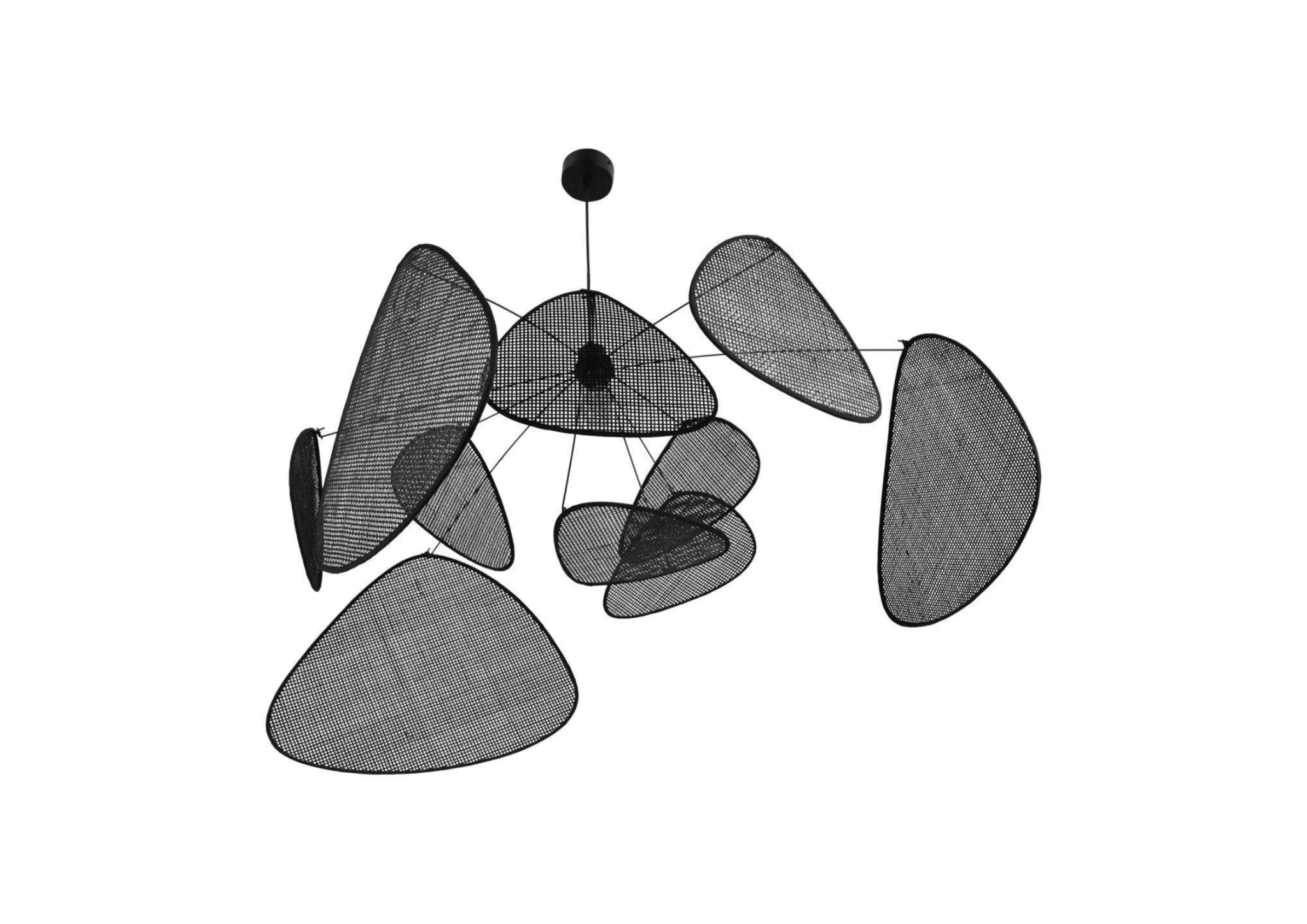Lampa sufitowa Screen w głębokim odcieniu czerni to niezwykle stylowy element oświetlenia, który doda wnętrzu elegancji. Konstrukcja wykonana z malowanego metalu wyposażona jest w 10 ekranów z trzciny wyłożonych tkaniną, tworząc unikalną kompozycję światła. Kolor czarnej tkaniny zapewnia subtelne, ale zdecydowane oświetlenie, dodając prestiżu i głębi każdemu pomieszczeniu.