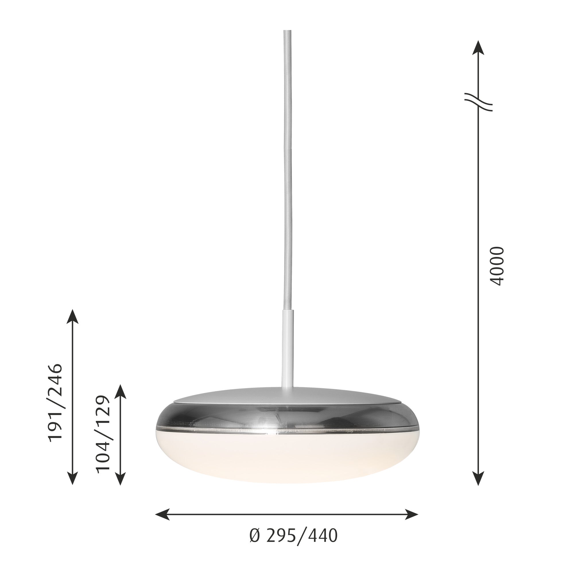 Materiały: Aluminium odlewane malowane proszkowo na biało (Ø 29,5), stal tłoczona malowana proszkowo na biało (Ø 44), tworzywo PMMA opalowe i półprzezroczysty poliwęglan metalizowany