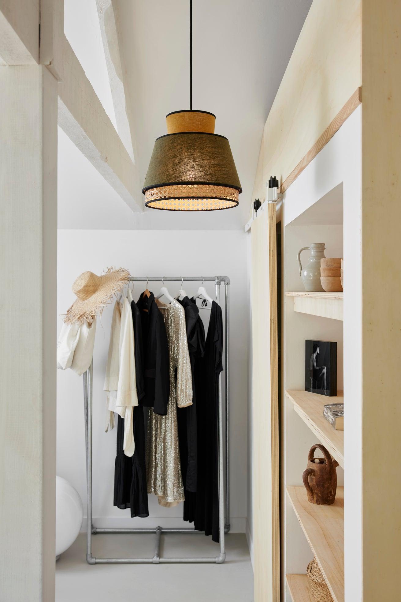 Lampa Singapour v olivovej farbe, súprava s tromi tienidlami z vyblednutého ľanu a prútia, vybavená textilným káblom a kovovým rohom s možnosťou prispôsobenia DCL, nie je len praktickým osvetlením, ale aj dizajnovým prvkom, ktorý dodá miestnosti jemný a elegantný akcent.