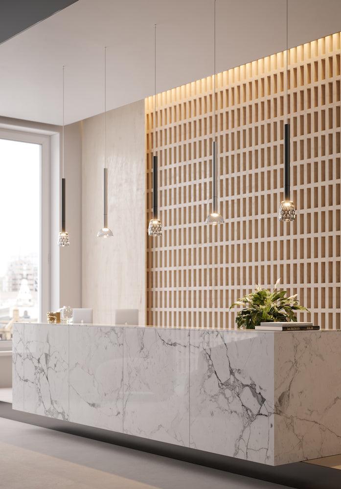 Jednoduchosť je tu kľúčová - jemný, lakovaný povrch sa hodí k krištáľovému tienidlu, čím vytvára elegantný efekt a jemné svetlo. Zavesť tri alebo viac lám spolu v línii, aby ste vytvorili zaujímavý efekt.