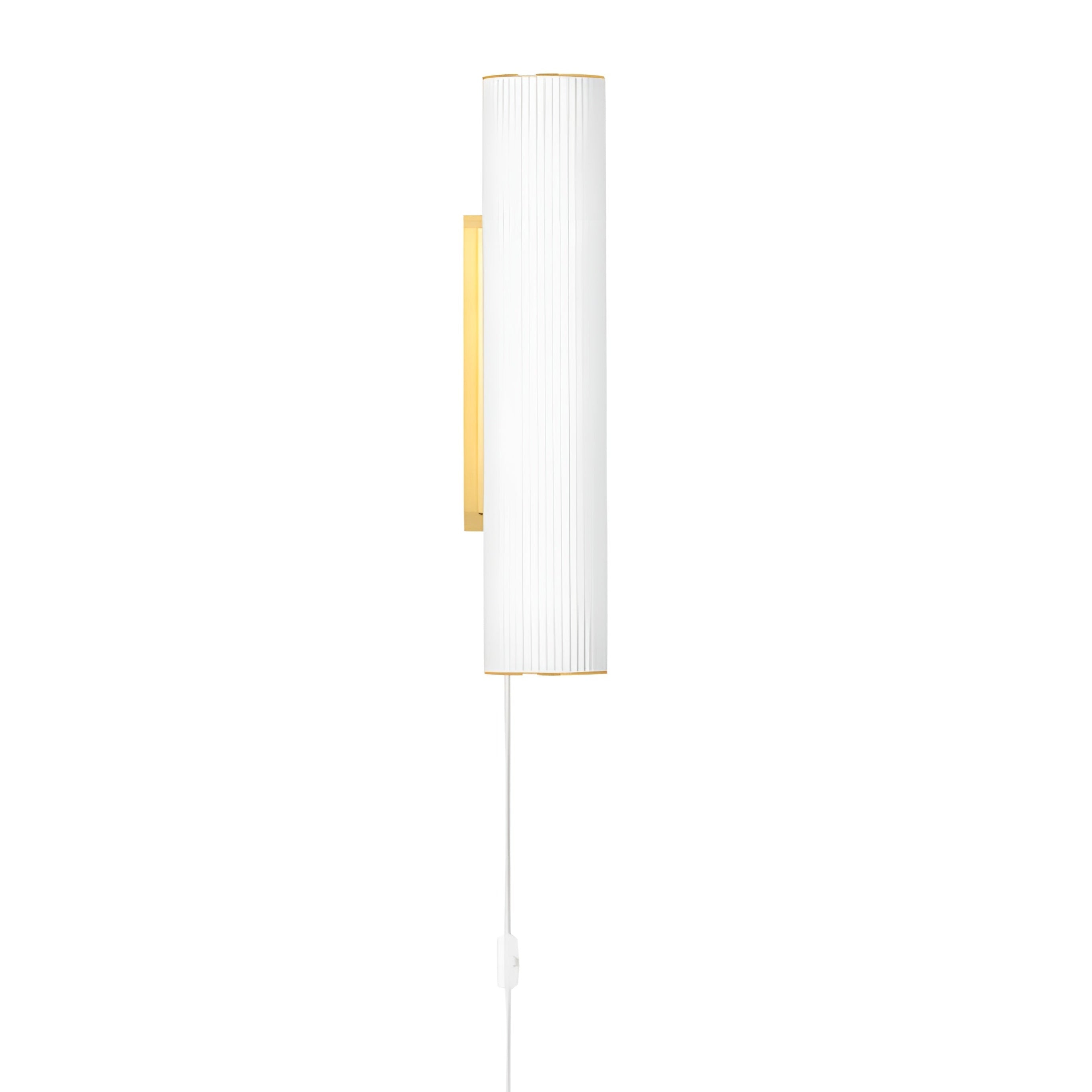 Materiały: ręcznie dmuchane szkło opalowe ryflowane, elementy z litego szczotkowanego mosiądzu, biały przewód materiałowy
