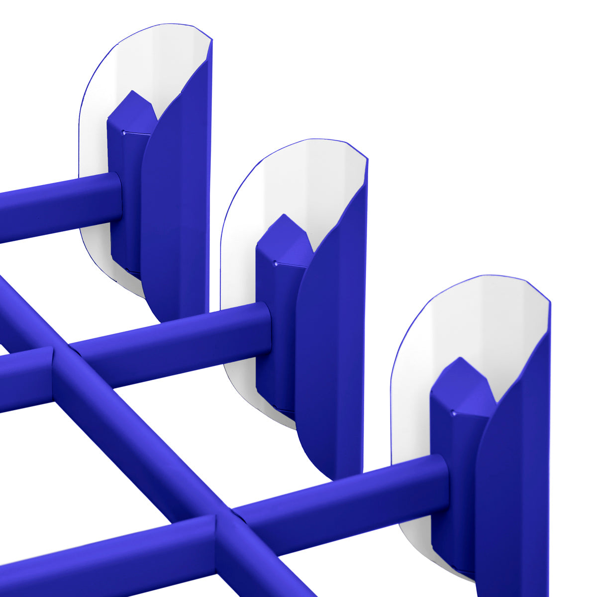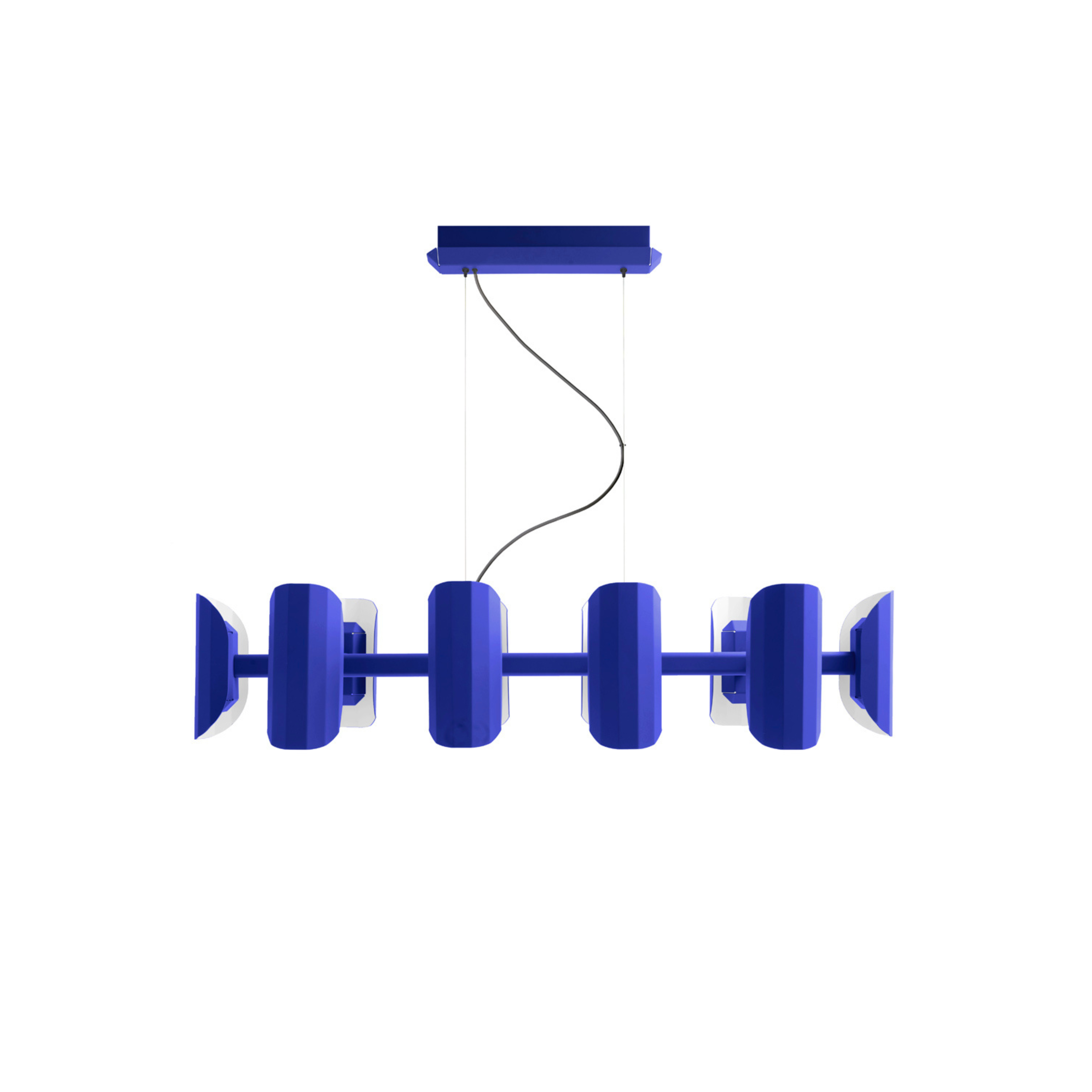 Viacramenná závesná lampa od dizajnérov Grynasz Studio v hlbokom kobaltovom odtieni je výrazná, industriálna forma inšpirovaná dizajnom poľských kovovýrobní z 50. až 70. rokov 20. storočia. Desiatiramenná konštrukcia s rozmermi 120 x 40 x 25 cm je vyrobená z lakovanej práškovej nehrdzavejúcej ocele a každá z fasetových krytov bola navrhnutá tak, aby jemne odrážala a rozptyľovala svetlo.