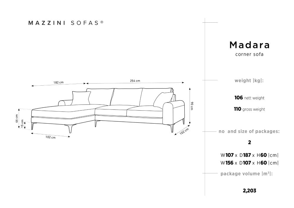 Vyvážené proporcie prinesú nádych elegancie do obývacej izby, a detaily ako prepojenia švov dodajú šmrnc každej aranžmácii. Tvar rohovej sedačky bol zvýraznený štýlovými nožičkami, ktoré dodávajú celku ľahkosť a výnimočný charakter. Polokruhové opierky rúk zaujímavým spôsobom prelomia minimalistický tvar konštrukcie Madara. V kombinácii s ďalším nábytkom z kolekcie rohovej sedačky vytvorí výnimočný súbor na oddych do obývacej izby pre celú rodinu.