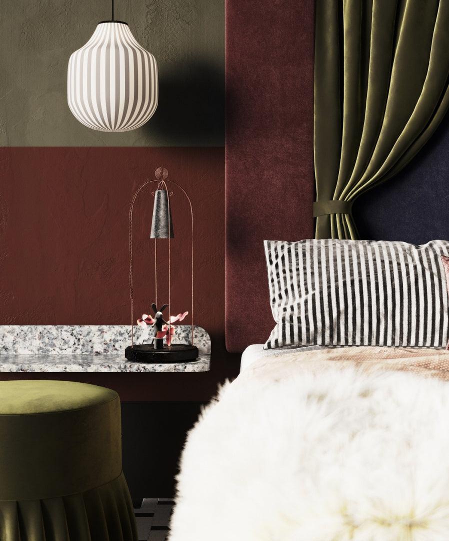 Tento úžasný projekt Kataríny Jasyk je esenciou moderné elegancie. Posteľ je potiahnutá príjemnou na dotyk a odolnou sametovou tkaninou. Výnimočné čelo, ktoré vytvorí atmosféru ako z Alenky v ríši divov, pripomína divadelnú oponu. Keď sa ráno prebudíte v takej výnimočnej aranžmáne, deň sa okamžite stane krajším.