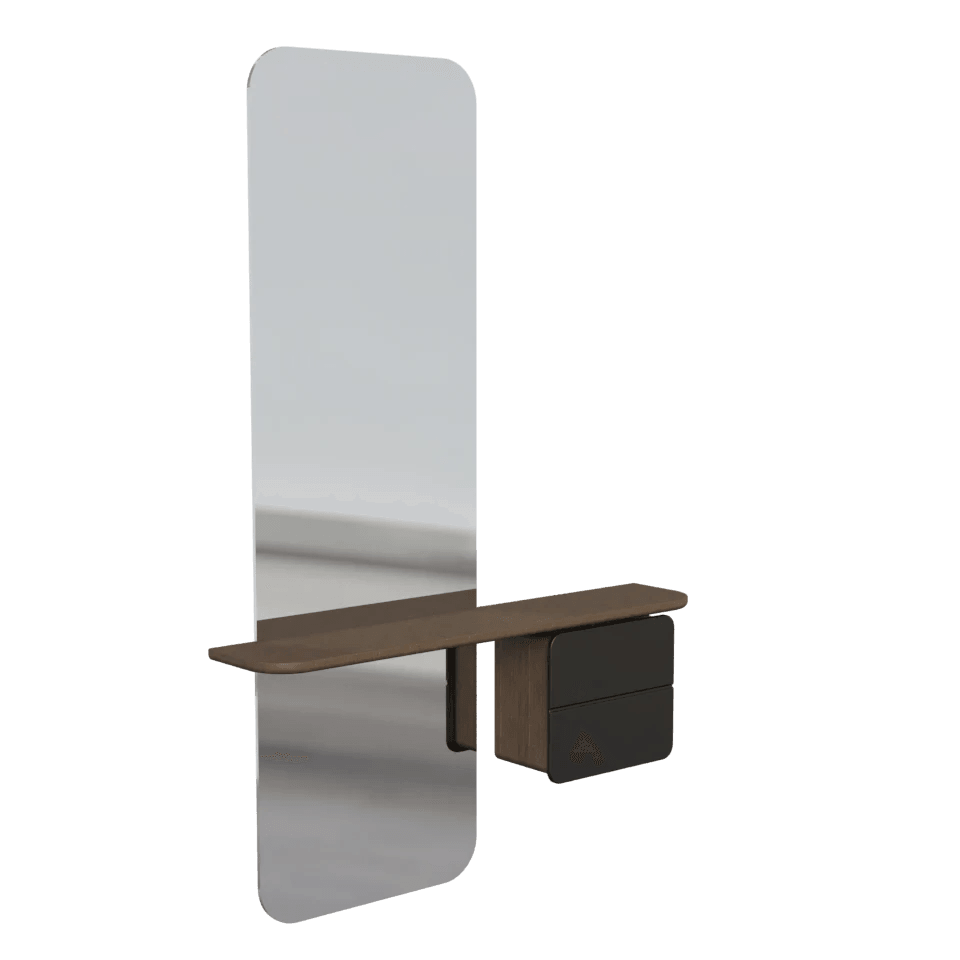 Vďaka správnej výške zrkadlo poskytuje odraz po celej svojej dĺžke, čo umožňuje dokonalú prípravu pred odchodom z domu. Navyše, zrkadlo je vybavené poličkou a malou skrinkou s praktickým zrkadielkom a koženým podnosom – ideálne riešenie na uskladnenie každodenných predmetov, ako sú kľúče, kozmetika, slnečné okuliare či náhradné mince.