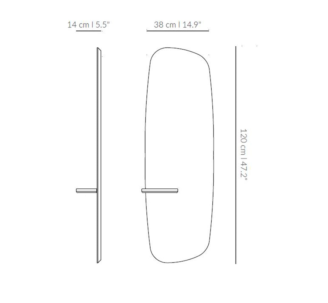 Nástenné zrkadlo Pared je elegantný návrh pre moderné a nadčasové interiéry, ktorý spája štíhlu formu s funkčným detailom. Subtílna plocha bola doplnená ručne vyrobenou drevenou poličkou, vďaka čomu toto designerské zrkadlo nielen odráža svetlo, ale tiež umožňuje pohodlne odložiť kľúče či drobné doplnky.