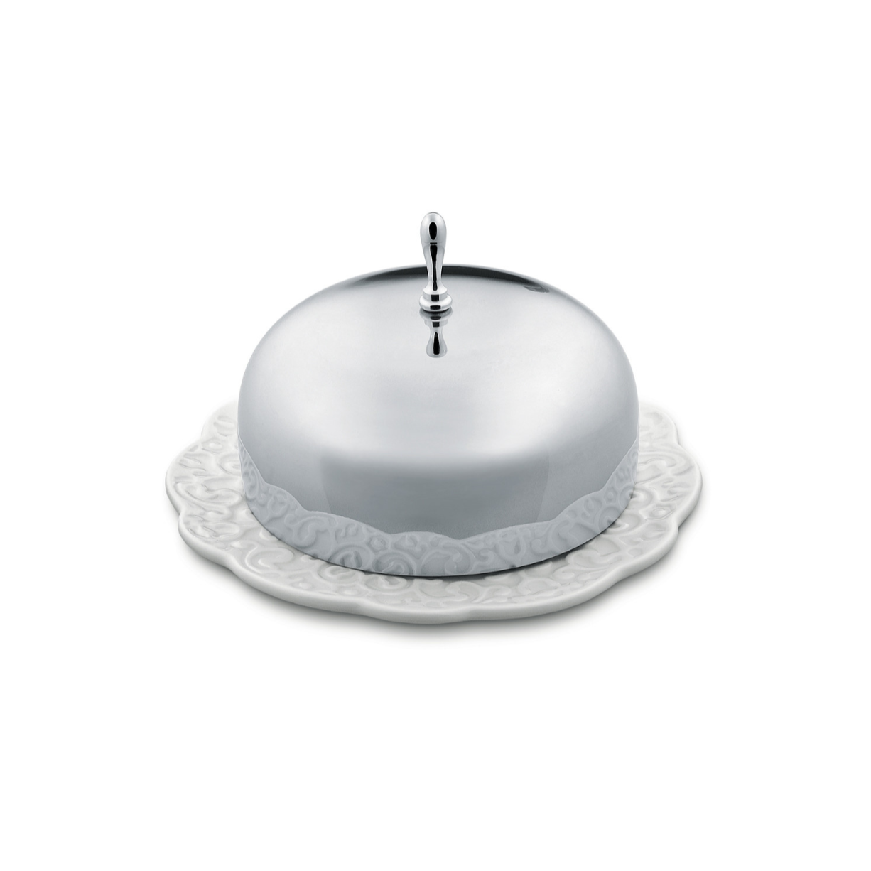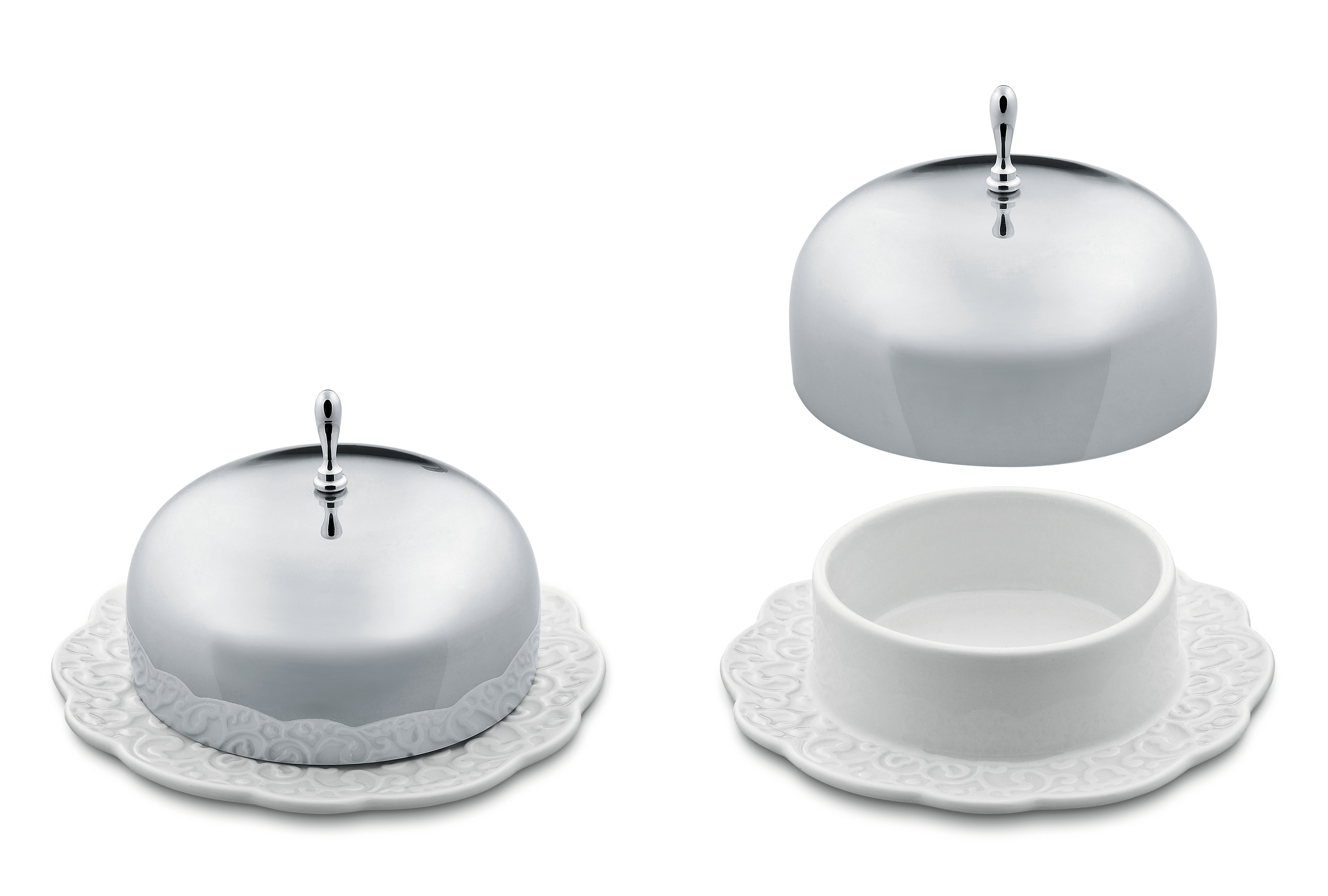 Maselnica z kolekcie Dressed je spojenie klasickej formy s moderným akcentom. Vyrobená z porcelánu a nehrdzavejúcej ocele, priťahuje pohľady jemnými, subtílnymi ozdobami skrytými na povrchu tanierika, ktoré jej dodávajú rafinovaný charakter. Nie je to len praktický prvok na stole, ale aj dekorácia, ktorá obohacuje každú aranžáciu o nádych elegancie a štýlu, odkazujúc na tradičné tvary v modernej interpretácii.