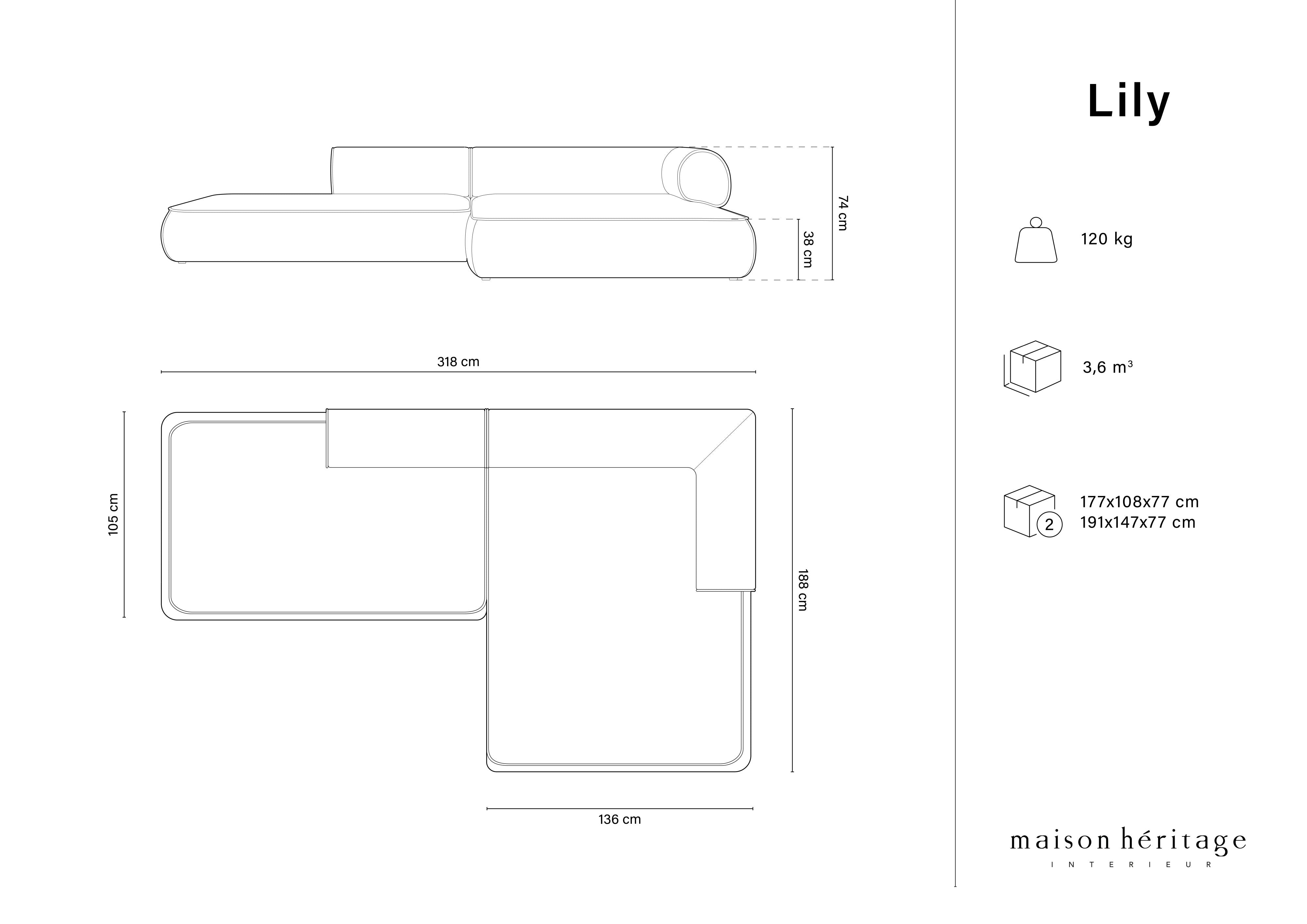 Hlboké sedadlá sú pružné a mimoriadne pohodlné. Jemné prešívanie a prešívané detaily zdôrazňujú klasický charakter dizajnu. Vďaka nízkemu a rozložitému profilu rohový gauč Lily prinesie do interiéru kúsok útulnosti a tepla. V kolekcii sú dostupné rôzne kombinácie pohoviek a rohových gaučov, ako aj ležadlo a veľký puf, vďaka ktorým môžete vytvoriť jedinečný dizajn.