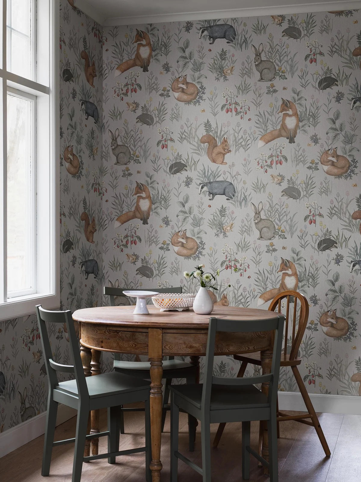 Mural Forest Friends je rozprávková nástenná dekorácia, ktorá vytvára v detskej izbe magický svet plný zvierat a prírody. Pôvabná kompozícia zobrazuje lesných hrdinov v prostredí rastlín, čím buduje útulný a inšpirujúci priestor na hranie a oddych. Ilustratívny charakter vzoru spôsobuje, že stena sa stáva jedinečným príbehom, ktorý rozvíja predstavivosť a vnáša teplú, pokojnú atmosféru.