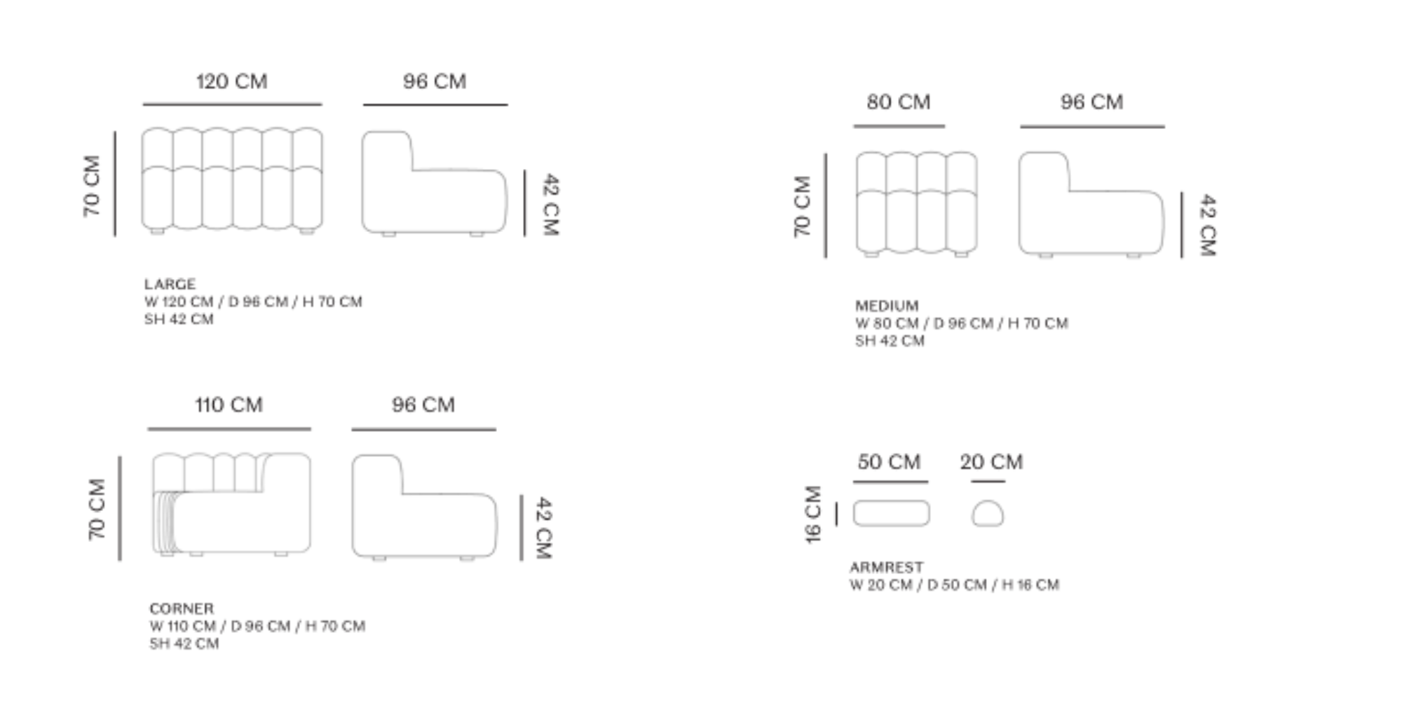 Narożnik składa się z modułu large, modułu medium, modułu corner i dwóch podłokietników.