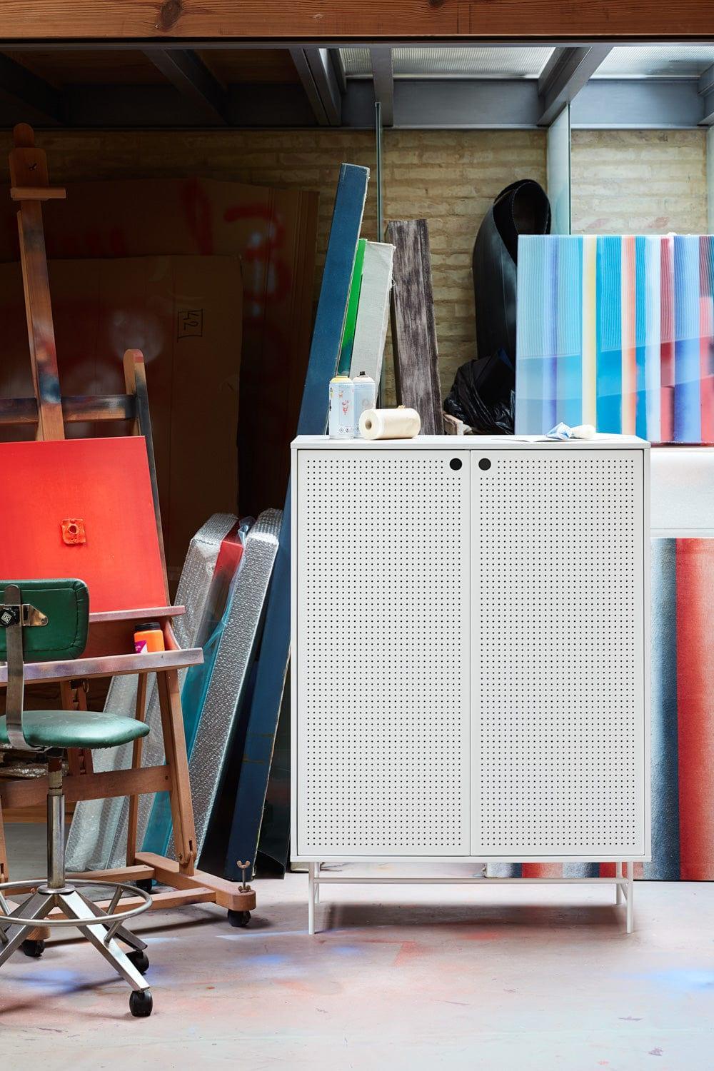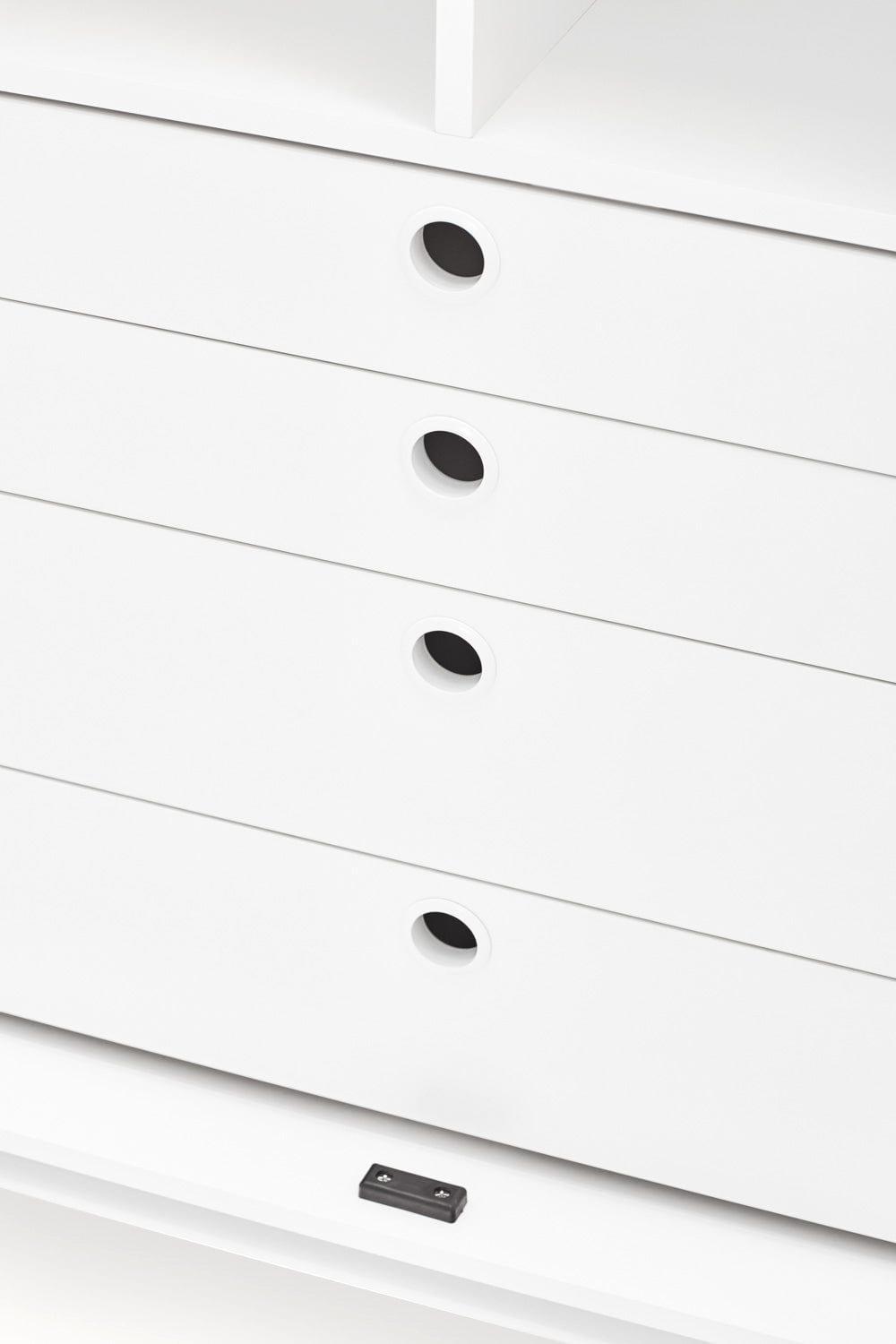 Perforované fronty dodávajú celej konštrukcii ľahkosť a robia ťažkým odtrhnúť od nich zrak. Elegantné biele vyhotovenie výrazne otepľuje celý vzhľad a dodáva skrini charakter.