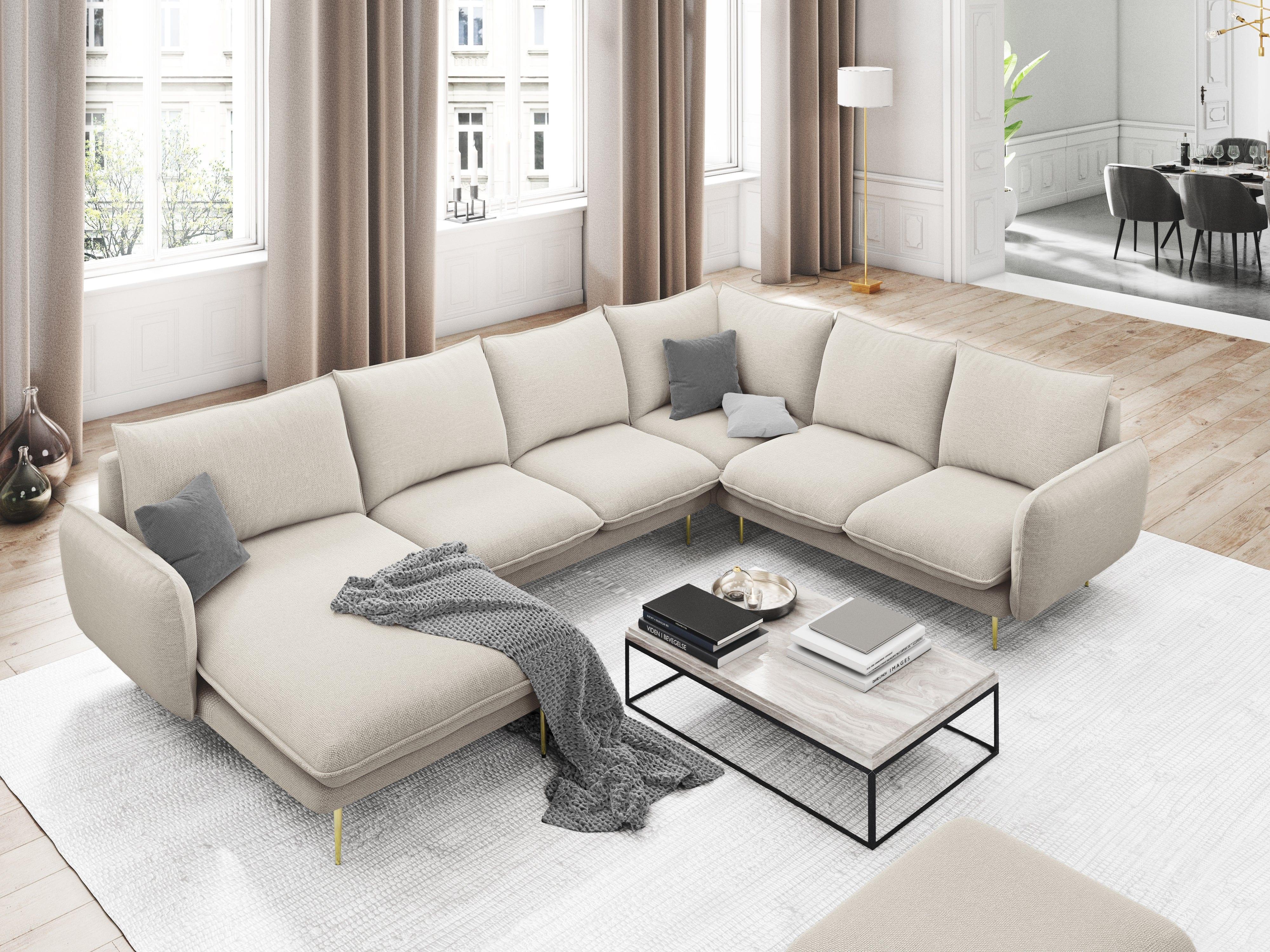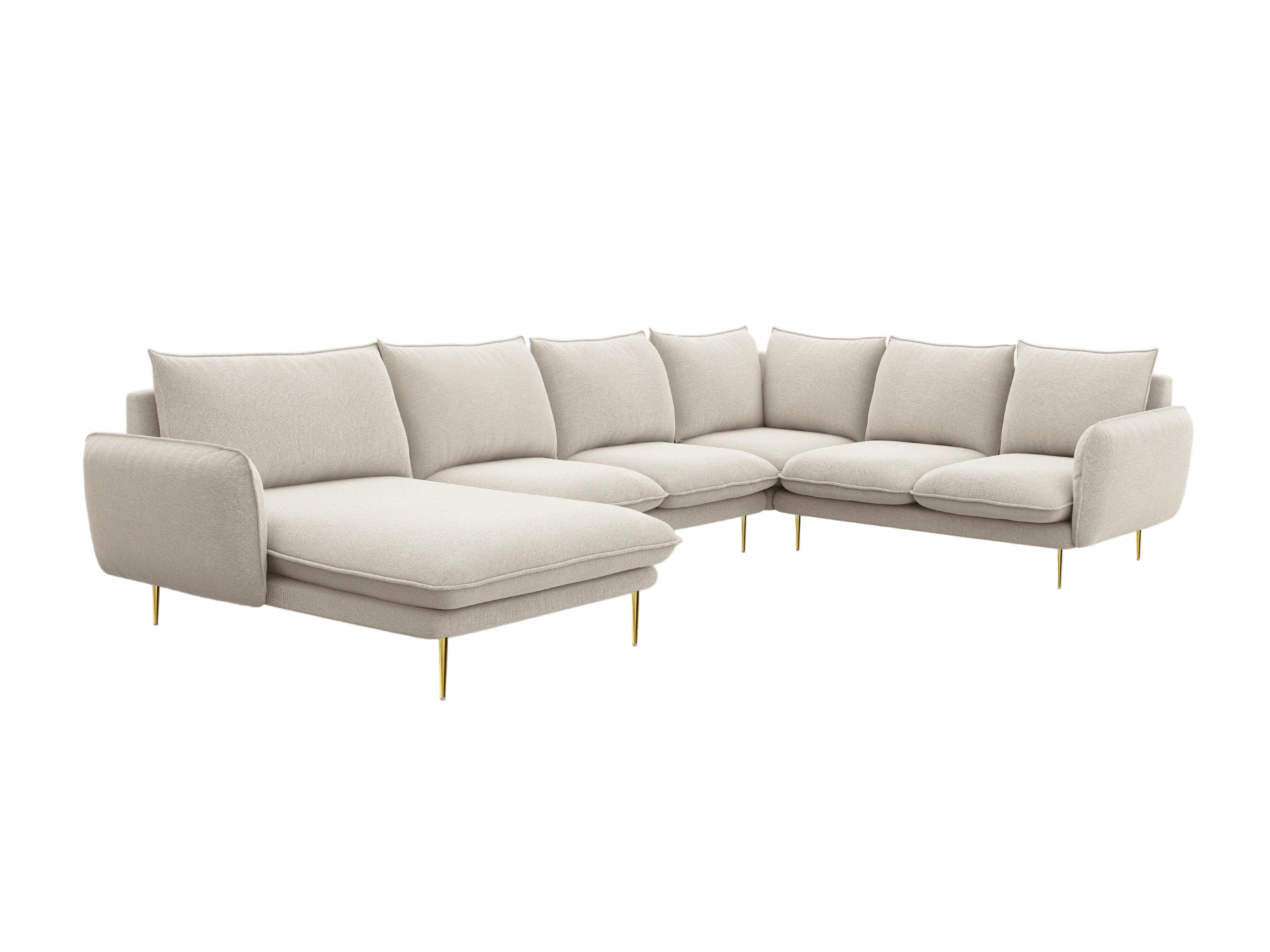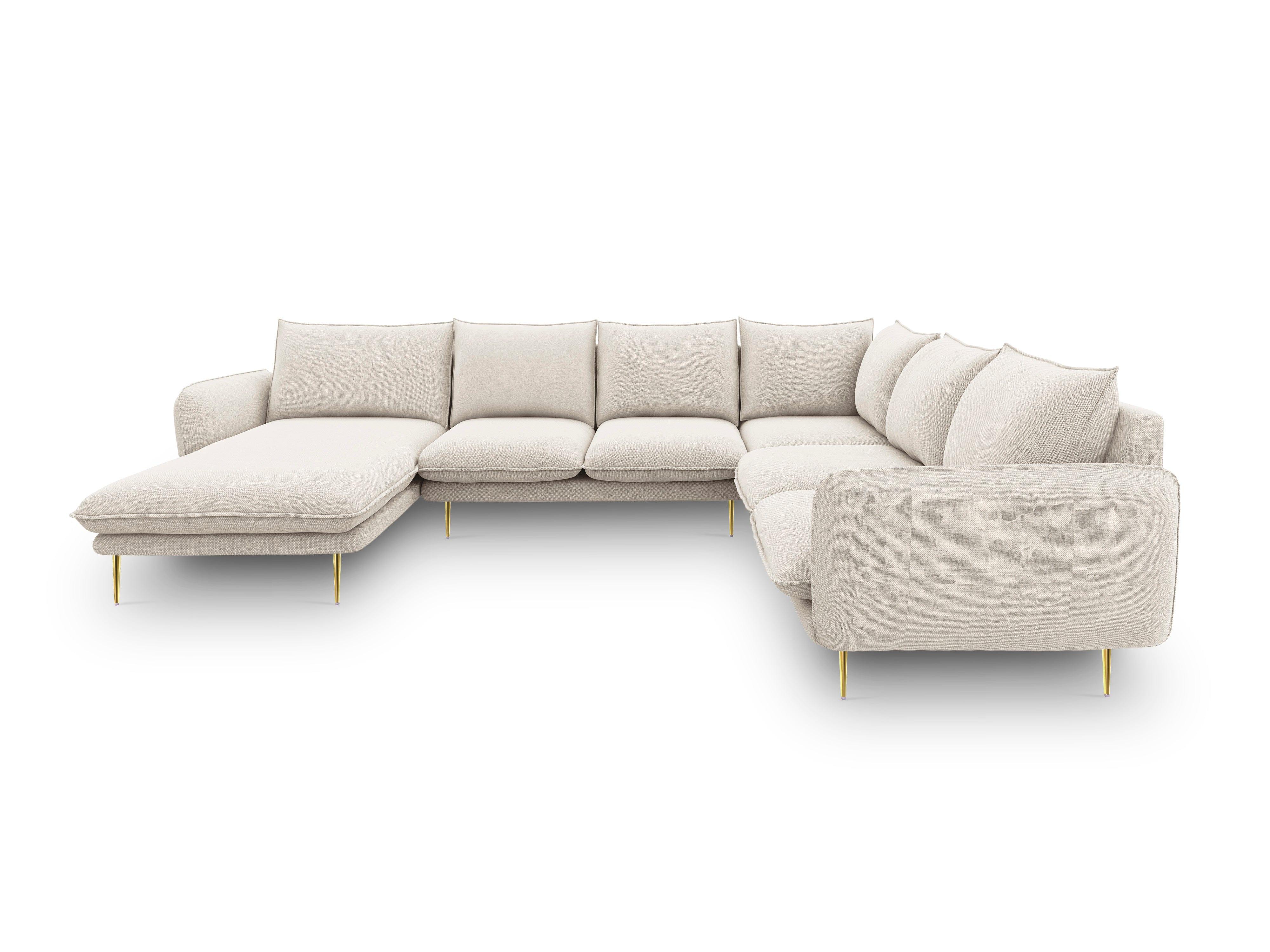 Narożnik panoramiczny prawostronny 7-osobowy VIENNA jasnobeżowy szenil ze złotą podstawą
