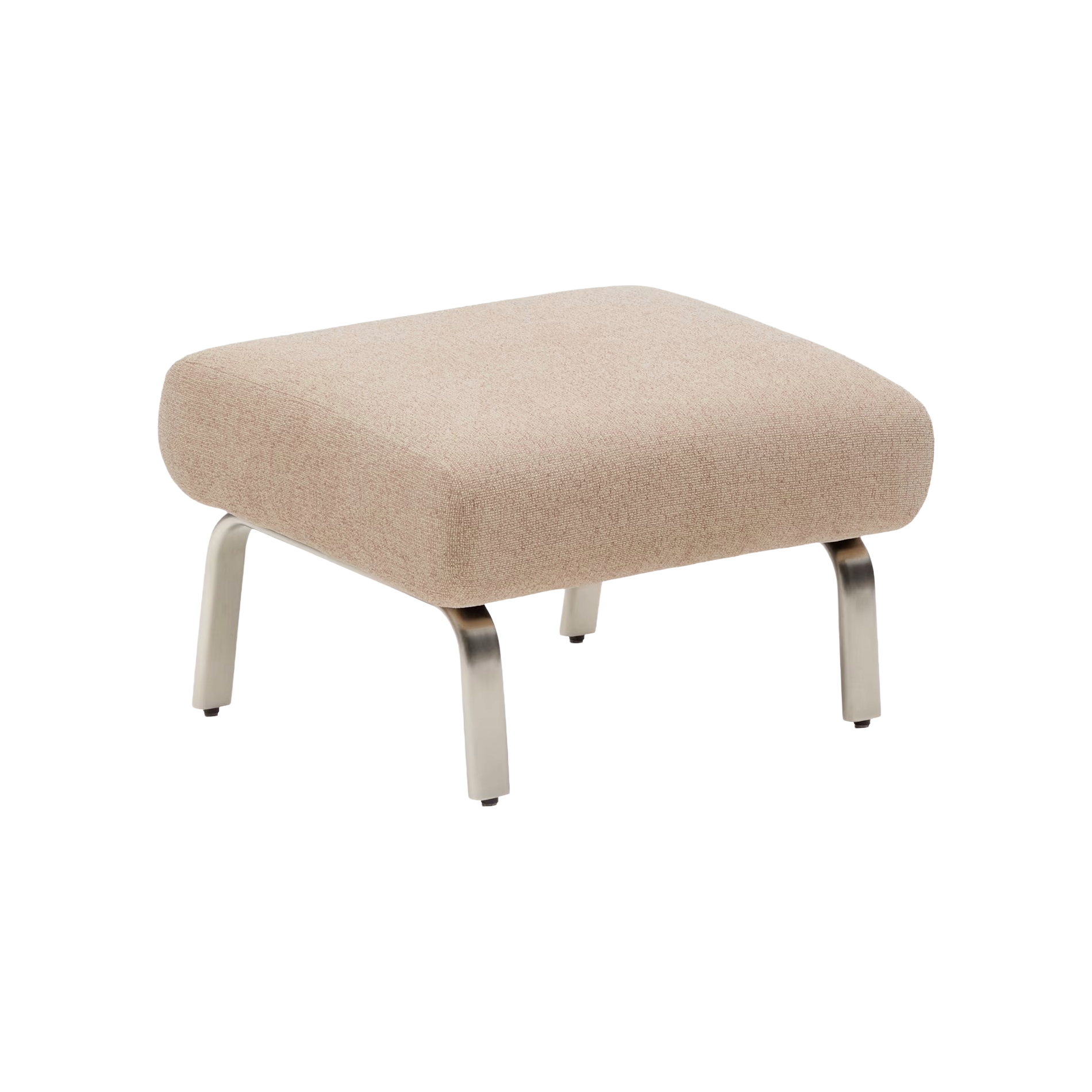 Solidna konstrukcja z certyfikowanego drewna FSC™ 100% i nóg ze szczotkowanej stali nierdzewnej gwarantuje trwałość i stabilność. Średnio twarde siedzisko, oparte na taśmach, sprężynach i piance o wysokiej gęstości, zapewnia idealny balans pomiędzy komfortem a wytrzymałością. To podnóżek tapicerowany, który może pełnić funkcję dodatkowego miejsca do siedzenia, stolika pomocniczego lub klasycznej podpórki pod nogi.