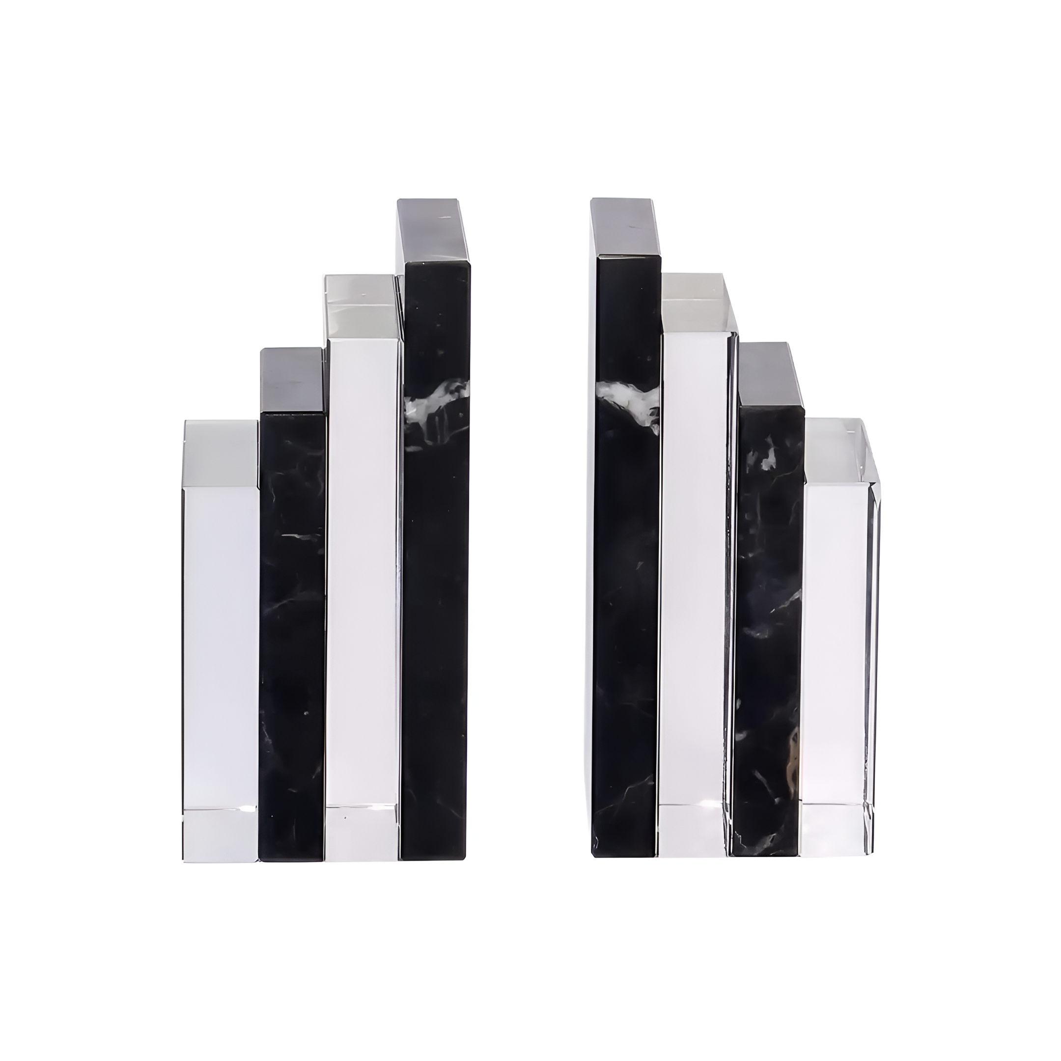 Ekskluzywna podpórka do książek Fancy wykonane z połączenia kryształu i marmuru to elegancki dodatek, który łączy w sobie luksus i funkcjonalność. Geometryczna forma oraz kontrast czerni i połyskujących powierzchni sprawiają, że prezentują się wyjątkowo stylowo, nadając wnętrzu nowoczesnego charakteru.