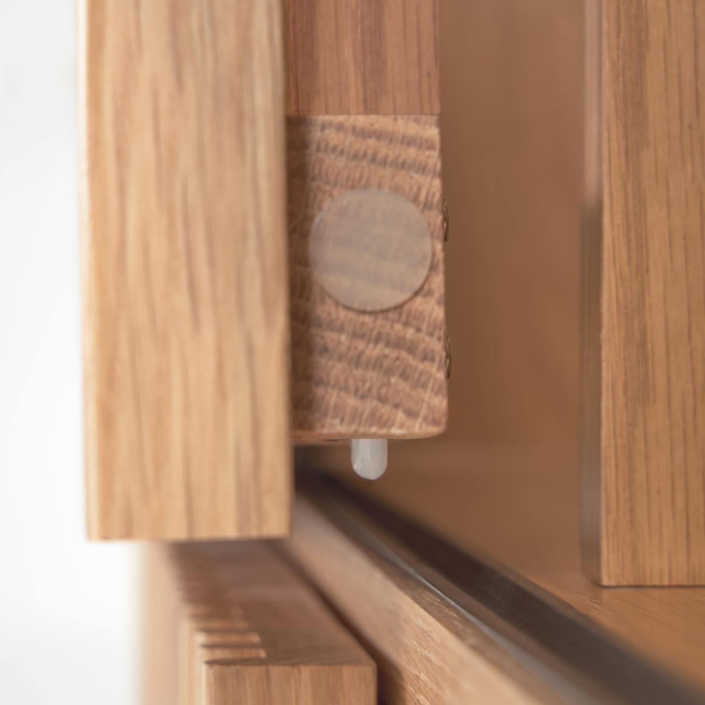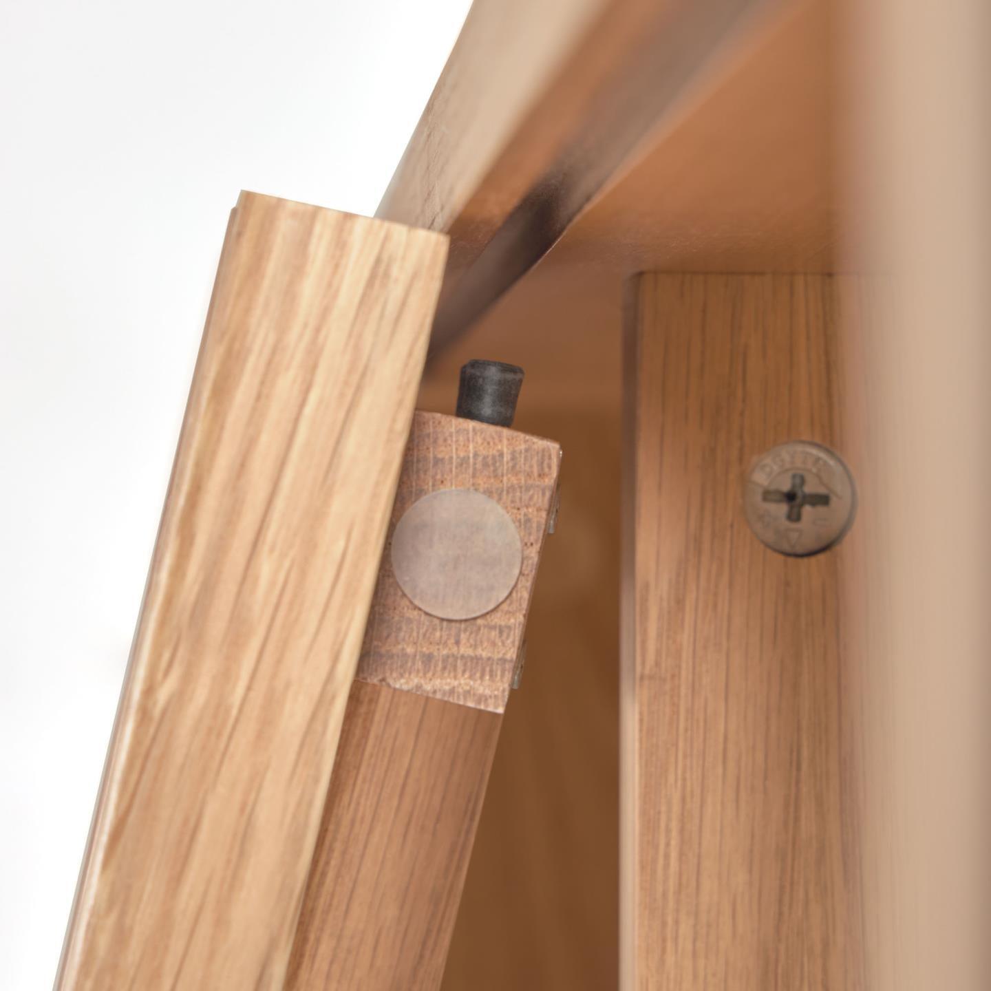 Materiał: 78% MDF E0 (płyta pilśniowa średniej gęstości o niskiej emisji formaldehydu klasy E0), 20% Fornir dębowy (Quercus alba), 2% Drewno jesionowe (Fraxinus Excelsior)