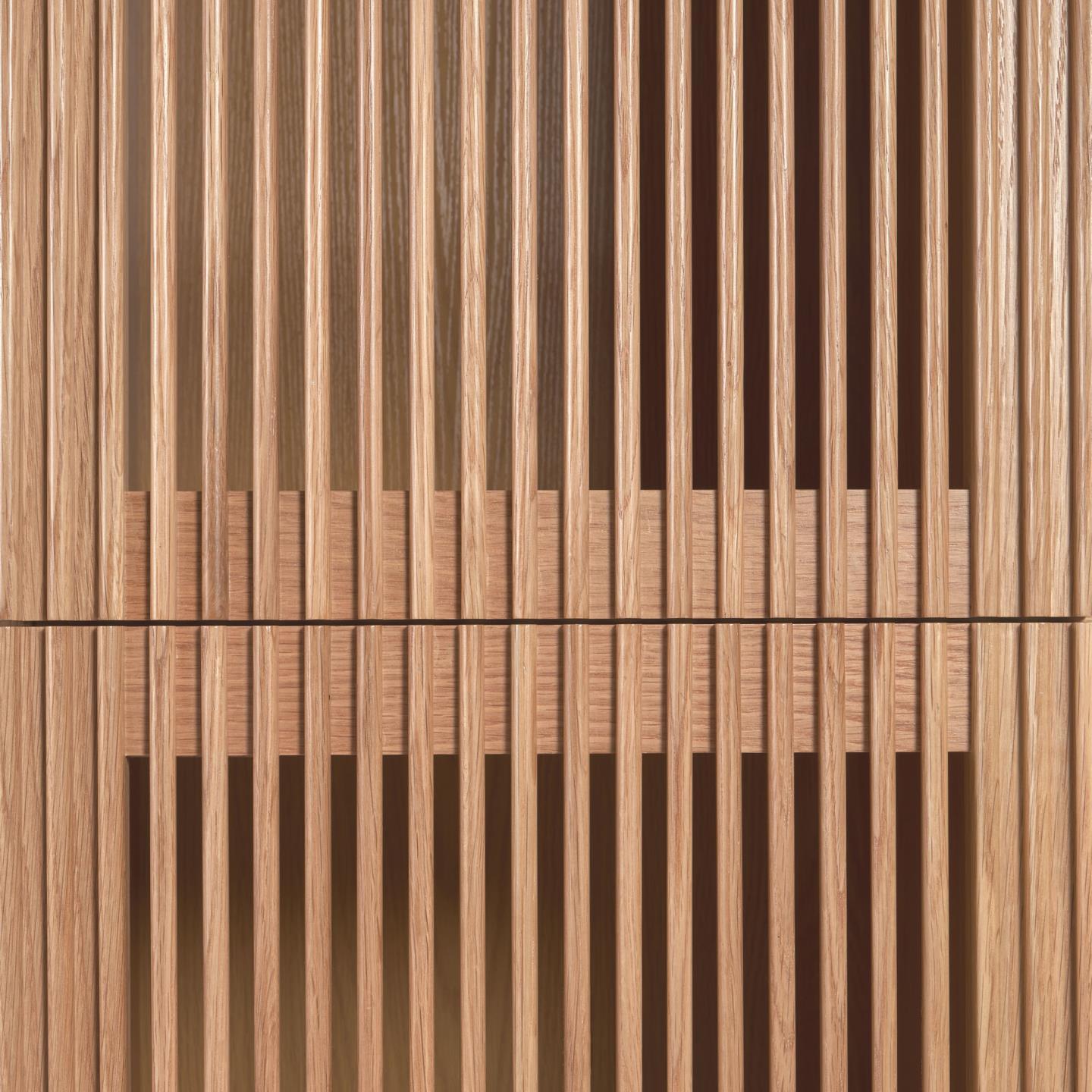 Regál Beyla nie je len praktickým priestorom na uskladnenie, ale aj vyjadrením starostlivosti o detaily a dôrazu na estetiku. Lištové dvere z masívneho dubového dreva vytvárajú jemné hry svetla, pridávajúc regálu jedinečný charakter. Starostlivo dbáme na každý detail, aby sme dosiahli úžasný dizajn, ktorý priťahuje pozornosť a zapadá do najnovších trendov dizajnu. Posuvné dvere vyrobené z masívneho dubového dreva dokonale ladia s korpusom v dubovej dyhe, vytvárajúc súdržný celok. Regál Beyla nielenže očaruje vzhľadom, ale aj zabezpečuje funkčnosť.