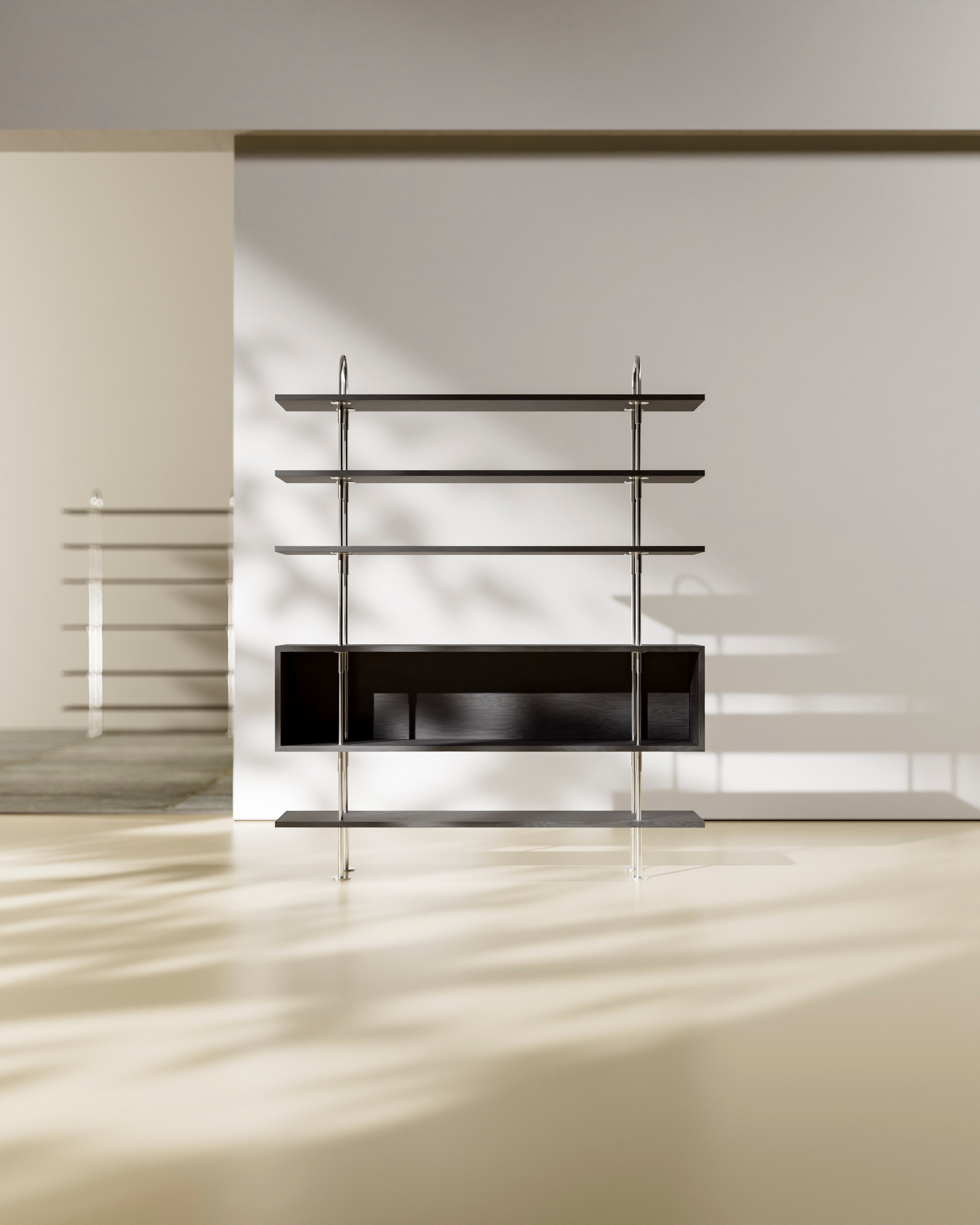 Moderný regál sa vyznačuje starostlivo vybranými materiálmi a sochárskym rytmom konštrukcie. Dostupné povrchové úpravy rámu v saténovej nehrdzavejúcej ocele alebo čiernom mosadznom prevedení v kombinácii s policami z jaseňového dyhy v odtieni hnedo-čiernej dodávajú celku hĺbku a eleganciu. Tento designerský regál nie je len praktickým miestom na uskladnenie, ale aj výrazným prvkom výzdoby, ktorý formuje charakter interiéru.
