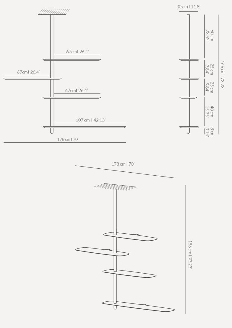 Regál závesný Unica v konfigurácii 06 je rozšírený, modulárny systém políc, ktorý umožňuje vytvoriť dynamickú a ľahkú kompozíciu na stene. Tento designerský nástený regál založený na centrálnom vertikále a rôznych dĺžkach políc sa skvele hodí ako regál do obývačky, kancelárie alebo komerčného priestoru, dodávajúc interiéru elegantný, architektonický charakter.
