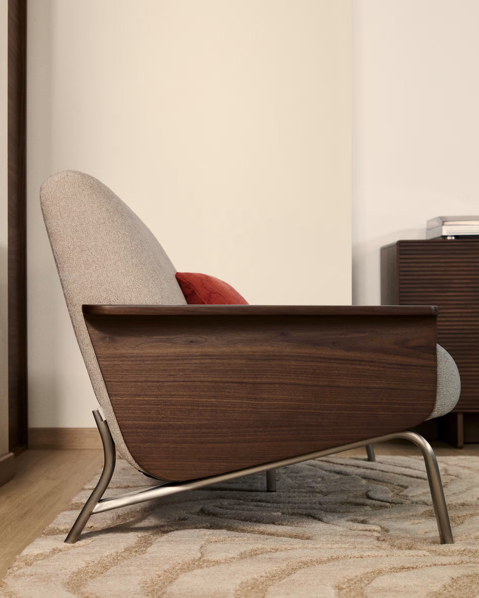 Materiały: 31% sklejka, 30% pianka, 23% stal nierdzewna, 12% fornir orzechowy (Juglans nigra), 4% tkanina