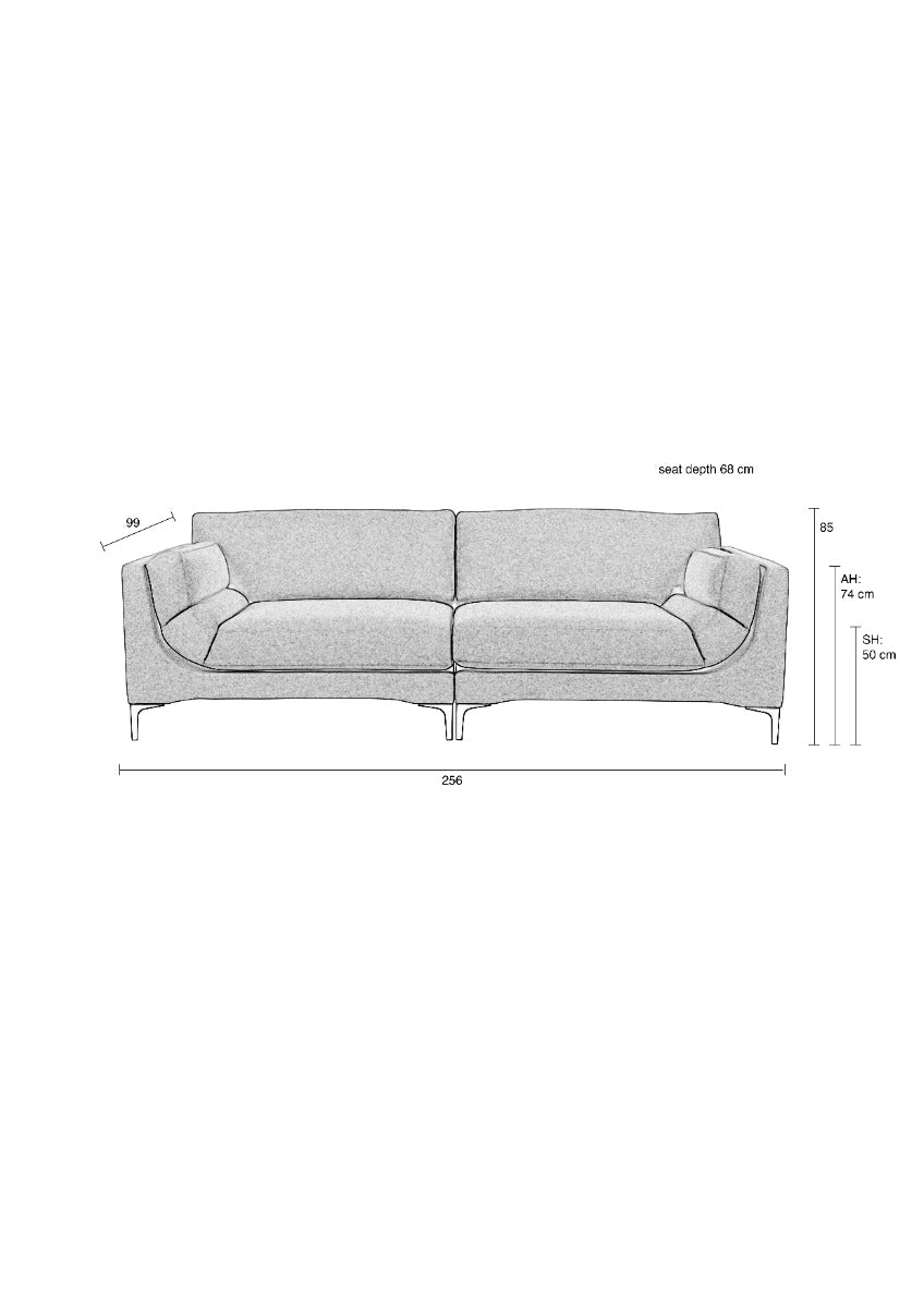 Materiał: tkanina mieszana (poliester i poliakryl). Siedzisko wypełnione pianką poliuretanową, poduchy oparciowe wypełnione pianką poliuretanową i włóknami silikonowymi. Konstrukcja z drewna świerkowego i płyty wiórowej. Nogi stalowe.