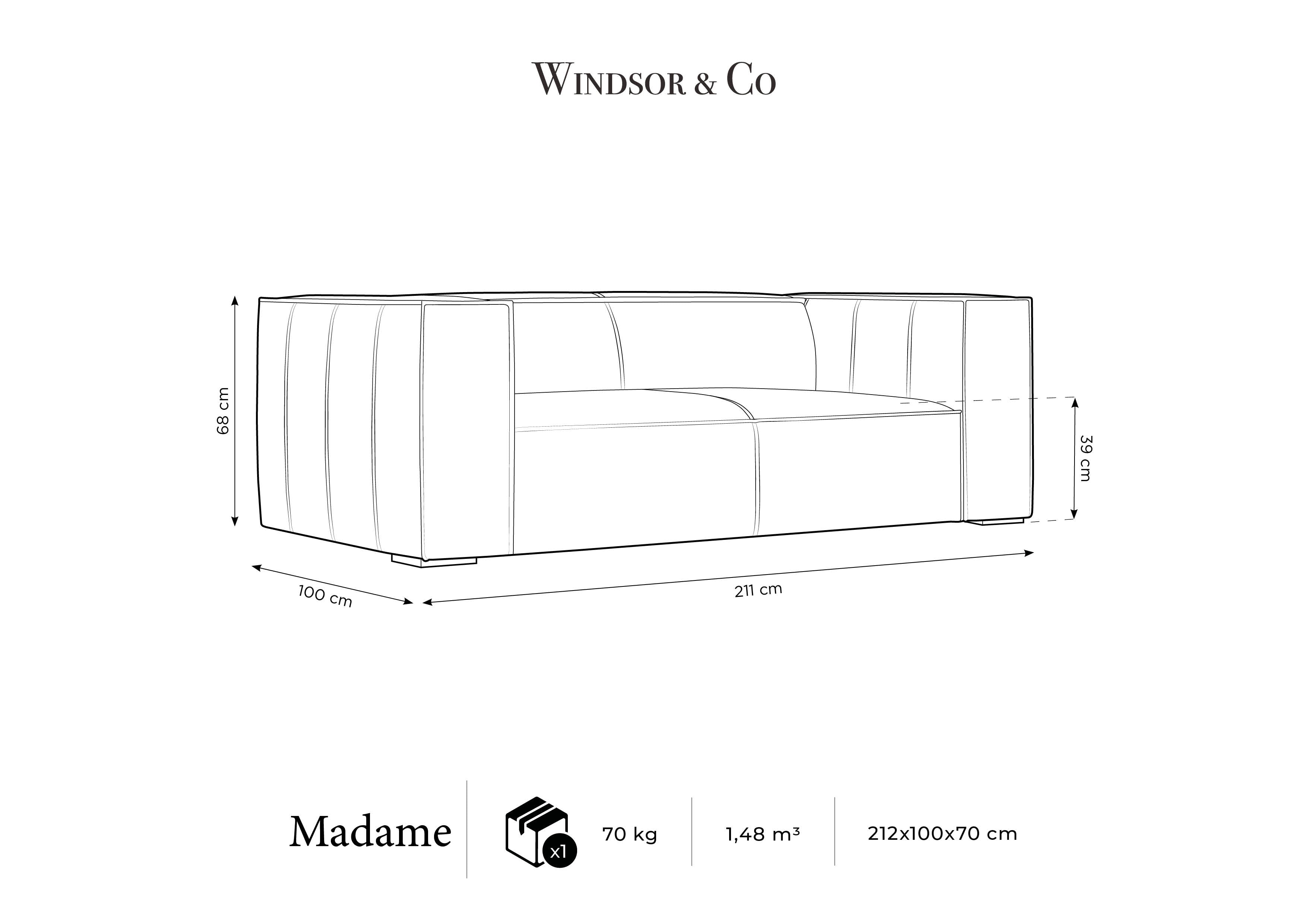 Sofa pre dve osoby Madame s výrazným charakterom a elegantným spracovaním je vynikajúcou voľbou do moderného obývacieho priestoru. Hlboké sedenie je ideálne na spoločenské stretnutia, ako aj na chvíle oddychu po náročnom dni. Umožňuje pohodlne relaxovať v uvoľnených polohách. S nízkym profilom, širokými opierkami na ruky a operadlami vytvára útulný tvar.