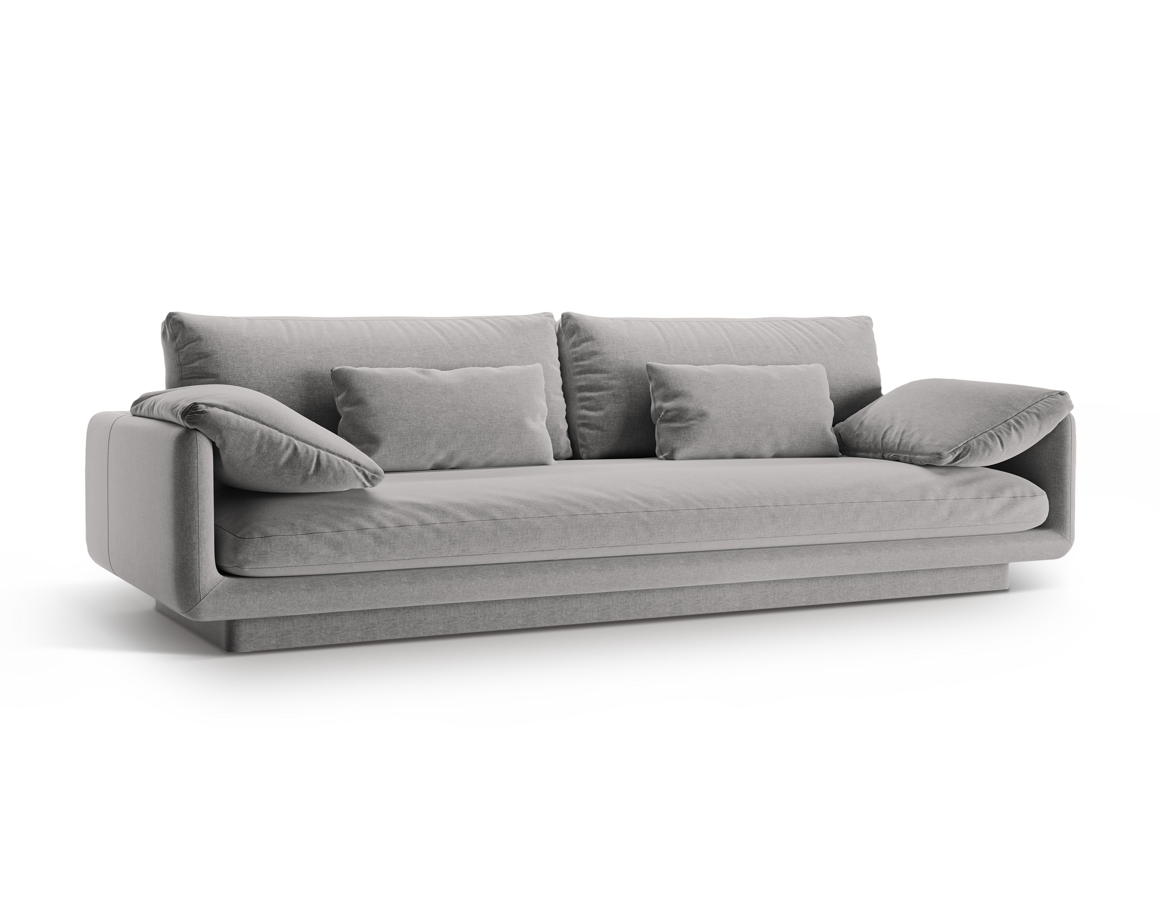 Sofa Torino je spojenie klasiky s moderným dizajnom, ktoré do interiéru prináša eleganciu a pohodlie. Jej konštrukcia spája ľahkosť proporcií s výnimočnou funkčnosťou, čo ju robí ideálnou pre rôzne aranžmány. Sofa sa vyznačuje jemným, ale zároveň inovatívnym detailom – pohyblivými opierkami rúk vo forme vankúšov, ktoré je možné sklopiť, čím sa nábytok prispôsobí individuálnym potrebám. Navyše, opierky rúk sú zošité s bokmi sofy, čo jej dodáva súdržnosť a eleganciu. Čalúnený základ nábytku a absencia nôh spôsobujú, že sofa pôsobí dojmom, akoby sa vznášala nad zemou, čo jej dodáva ľahkosť a moderný charakter.
