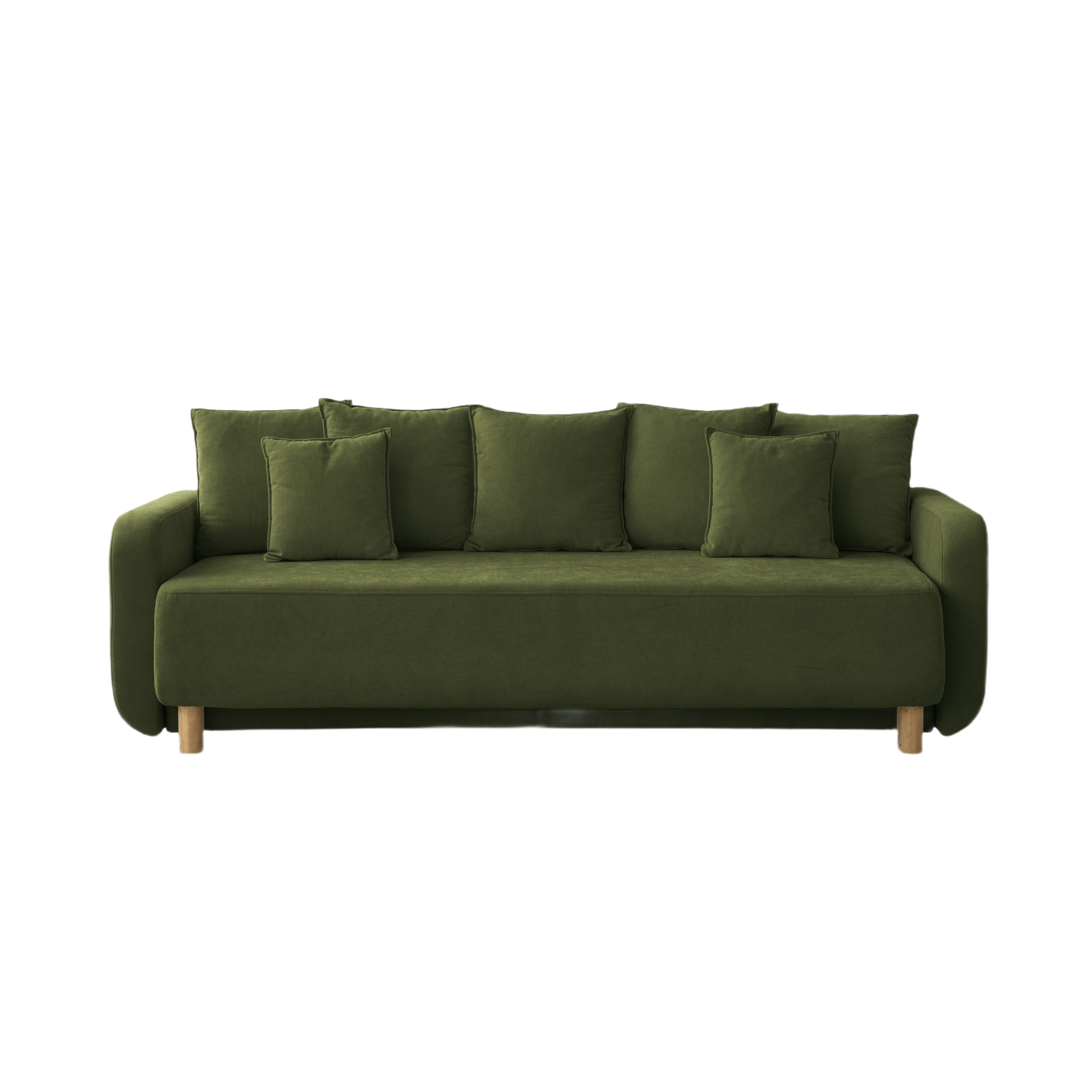 Model Elen očarí nielen vzhľadom, ale aj praktickosťou. Úložný priestor pod sedadlom je ideálnym miestom na posteľnú bielizeň alebo iné domáce doplnky, a súprava piatich veľkých oporných vankúšov a dvoch menších dekoračných vankúšov zabezpečuje pohodlie a útulný charakter. Jednoduché opierky rúk a drevené, valcovité nohy pridávajú ľahkosť celej konštrukcii, čím sa sofa Elen stáva elegantným a univerzálnym prvkom každého obývacieho priestoru.