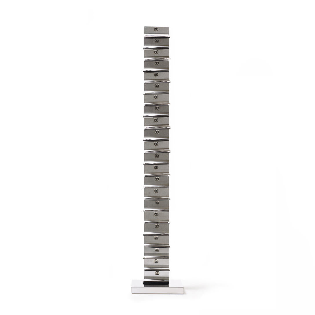 Ptolomeo Vino to dizajnový stojan na víno voľne stojaci, ktorý spája talianske úžitkové umenie s vášňou pre vinárstvo. Inšpirovaný ikonickou policou Ptolomeo, tento model prezentuje fľaše takmer magickým spôsobom – vytvára dojem, akoby sa vznášali vo vzduchu. Vďaka minimalistickej konštrukcii s diskrétnymi oporami sa pozornosť plne sústreďuje na obsah – etikety fliaš sa stávajú ozdobou samou o sebe.