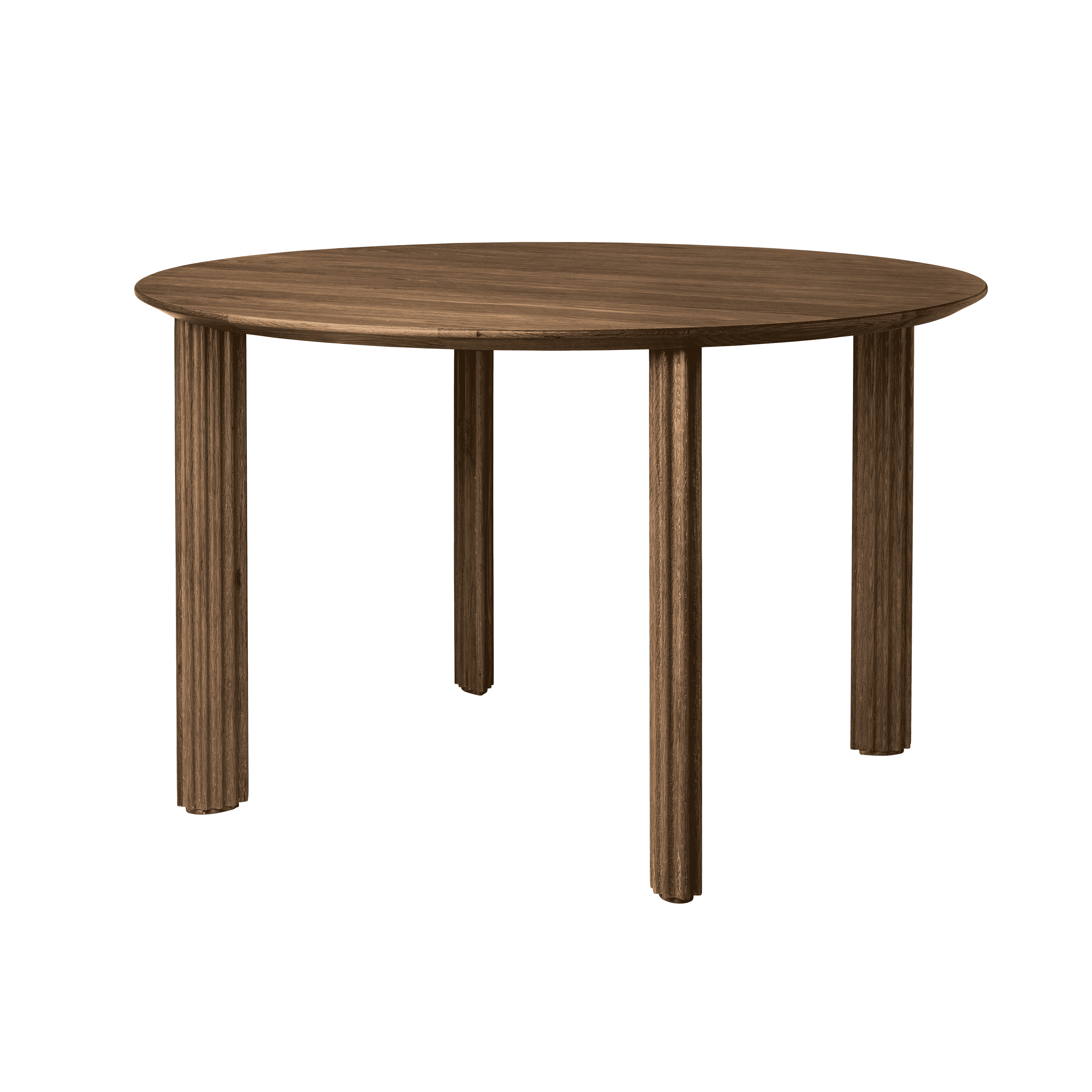 Stôl je dostupný v troch farbách: prírodný dub, tmavý dub a čierny dub, s priemerom 120 cm, ideálny pre štyri osoby.