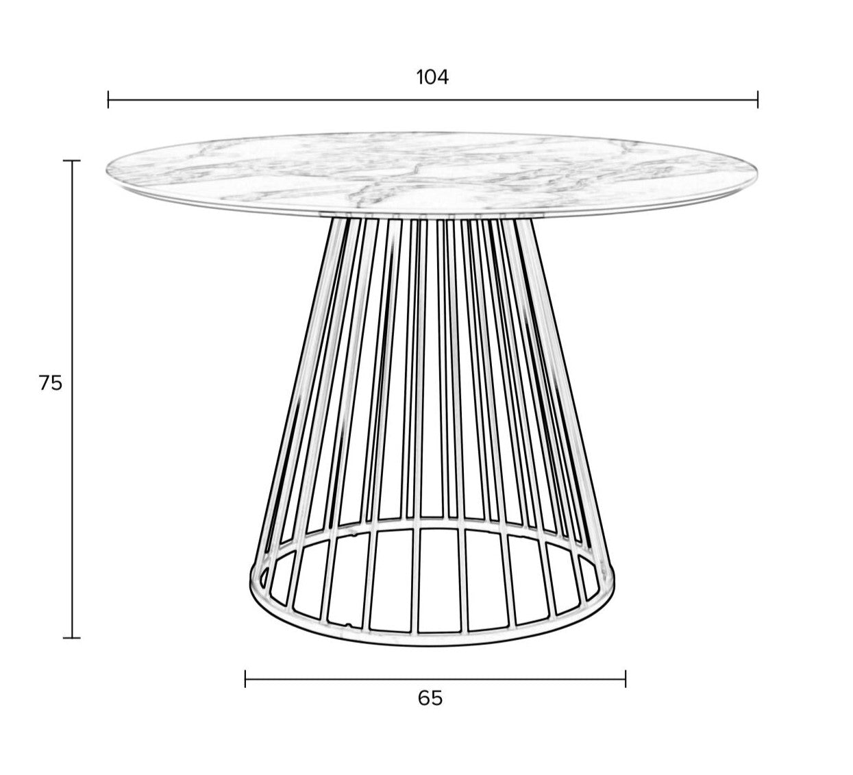Okrúhly stôl Floris je nábytok, ktorý upúta pozornosť svojím mramorovým vzorom dosky a jedinečnou konštrukciou základne. Doska spája MDF dosku a biely mramor s viditeľnými žilami, ktoré mu dodávajú šarm. Základňa stola je originálna, rozširujúca sa smerom nadol kolóna, pozostávajúca z pozinkovaných železných rúrok.
