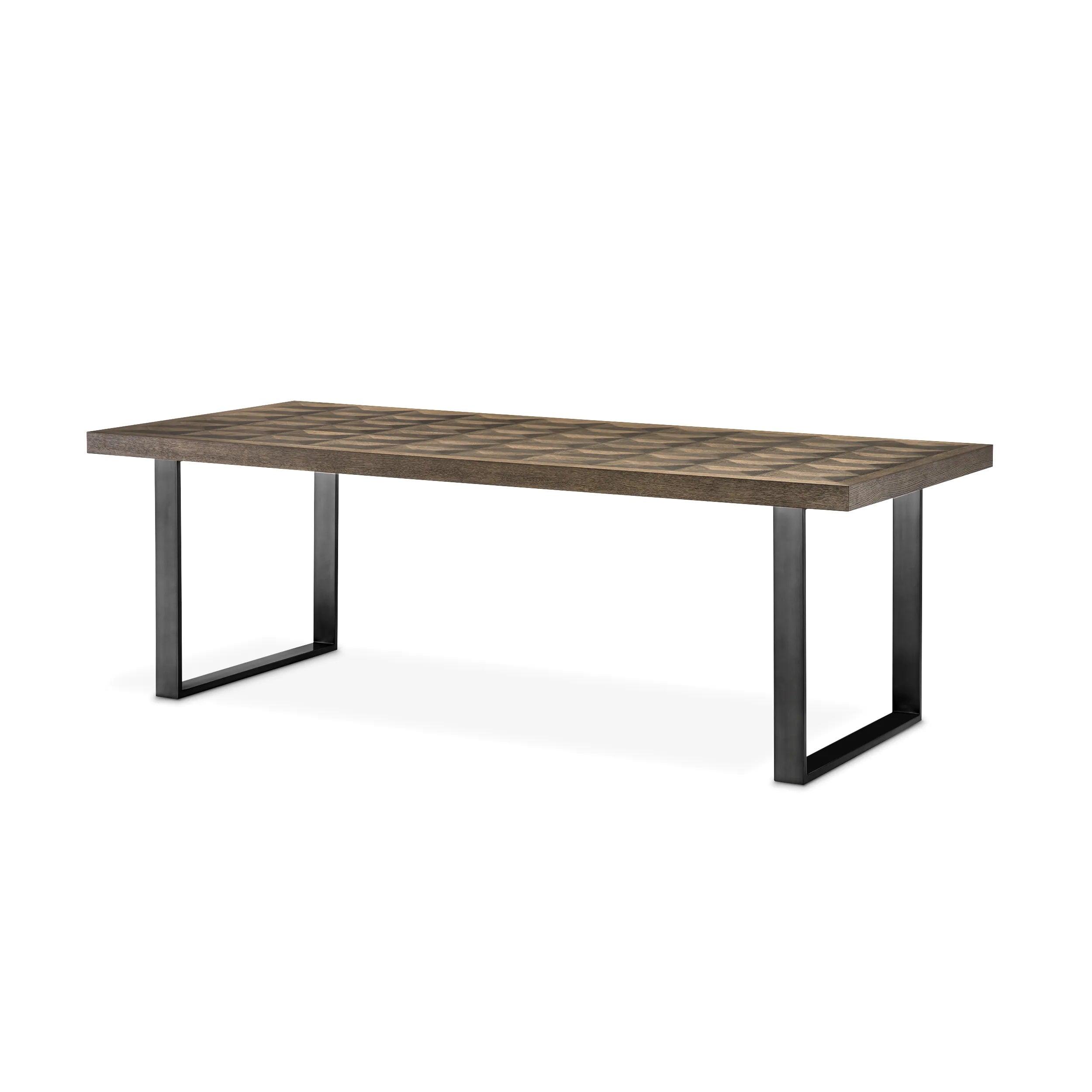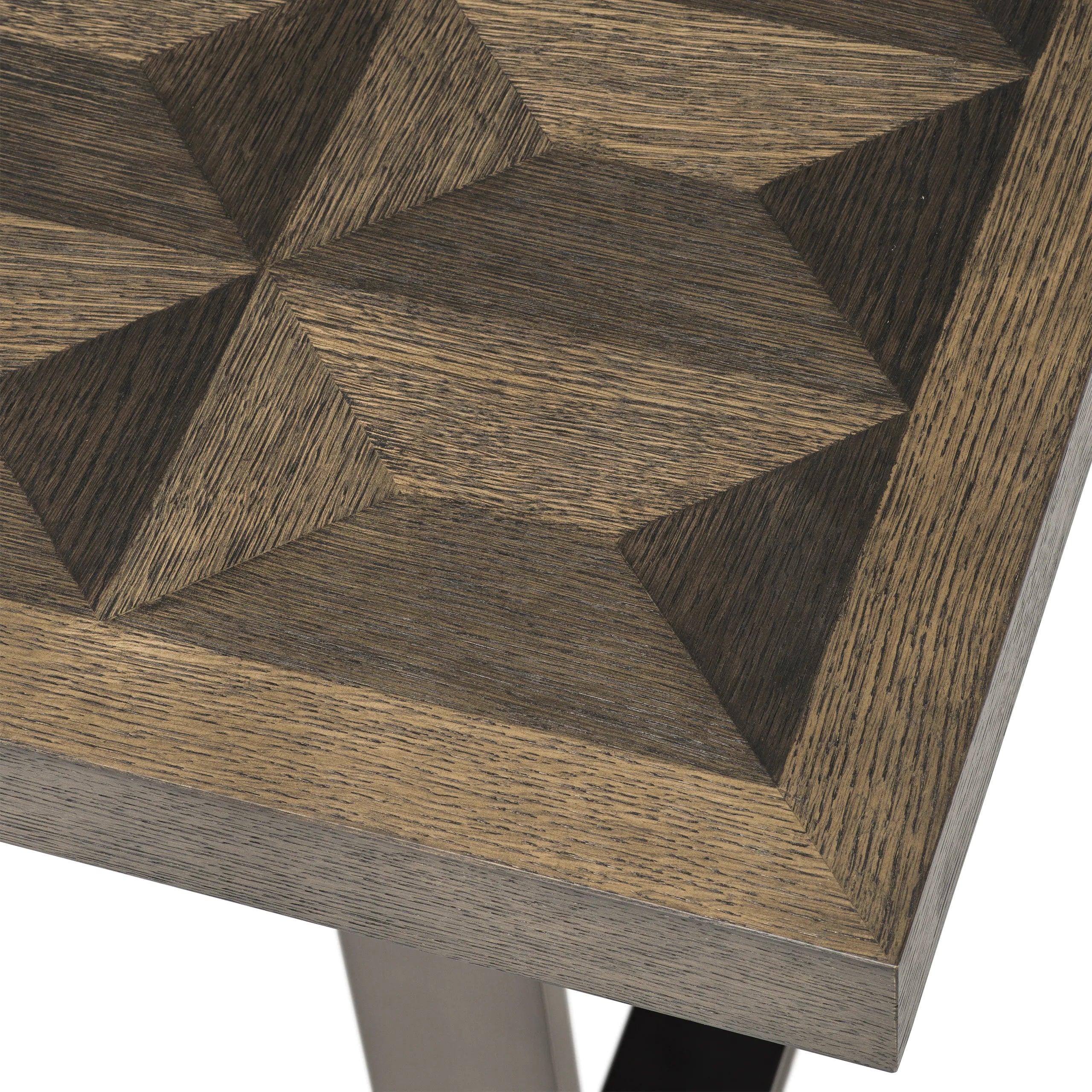 Na prvý pohľad upúta pozornosť jeho inkrustovaný vrch, kde geometrický vzor, dokonale prispôsobené kusy dyhy, vytvára fascinujúcu optickú ilúziu 3D. Táto mimoriadna technika pridáva hĺbku dubovému stolu a robí z vrchu stola stredobod pozornosti.