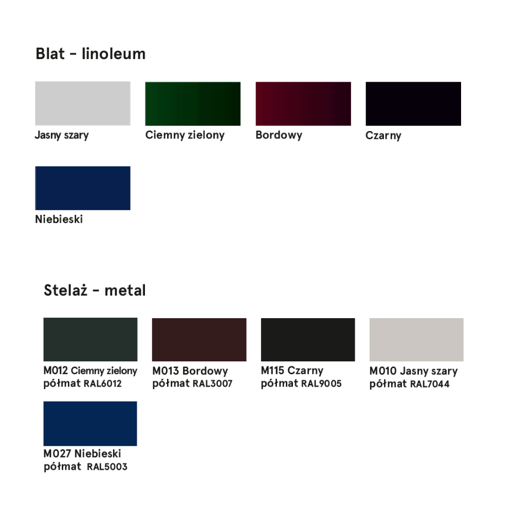 Blat – płyta MDF; pokryty bakteriostatycznym linoleum odpornym na odciski palców; obrzeże lakierowane
